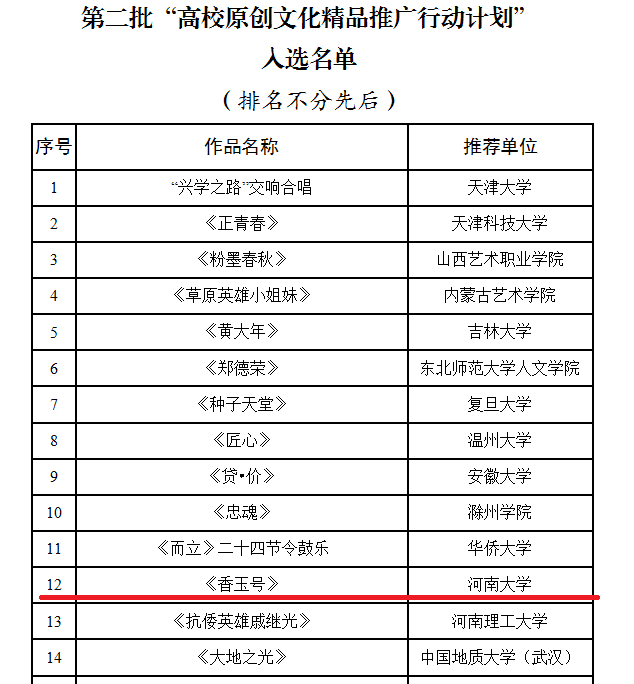 原创大型民族音乐剧《香玉号》入选第二批“高校原创文化精品推广行动计划”名单。同期公布的两批行动计划高校共有40所。