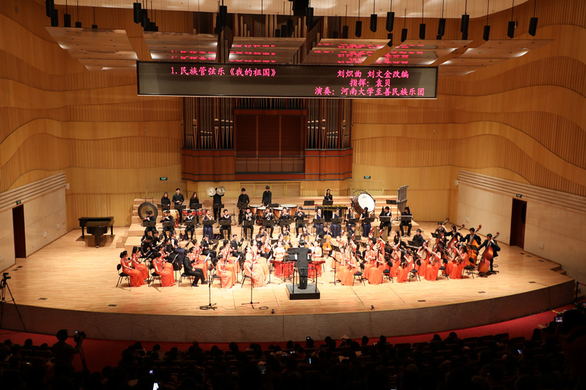 始终与时代同呼吸,与祖国共命运。开场曲目《我的祖国》以民族管弦乐的形式表达了河大人对祖国的真挚热爱,现场观众无不动容。歌曲《在希望的田野上》热情讴歌神州大地的伟大变革与亿万人民锐意开拓的精神。一条路架起中国与世界的桥梁,一条路打开繁荣与希望的大门,民族管弦乐《丝绸之路》时而低沉婉转,时而高亢激昂,让观众在具有东方神秘气息的音乐世界中感受丝绸之路的壮丽与辉煌。一曲《在那桃花盛开的地方》则将人们带入山青水秀的乡村与雪花飞舞的边疆,展现和平宁静的美丽中国。