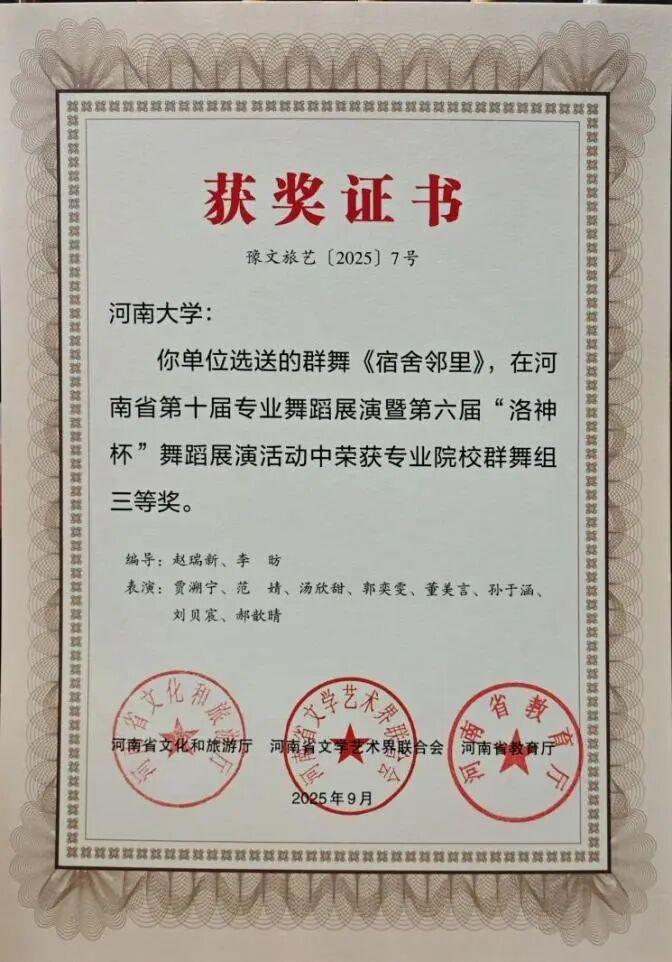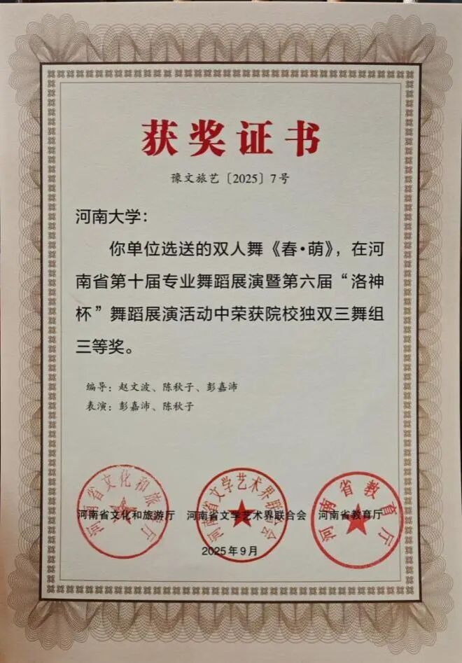 三等奖3项:原创当代群舞《宿舍邻里》、原创双人舞《春·萌》、原创独舞《氓》