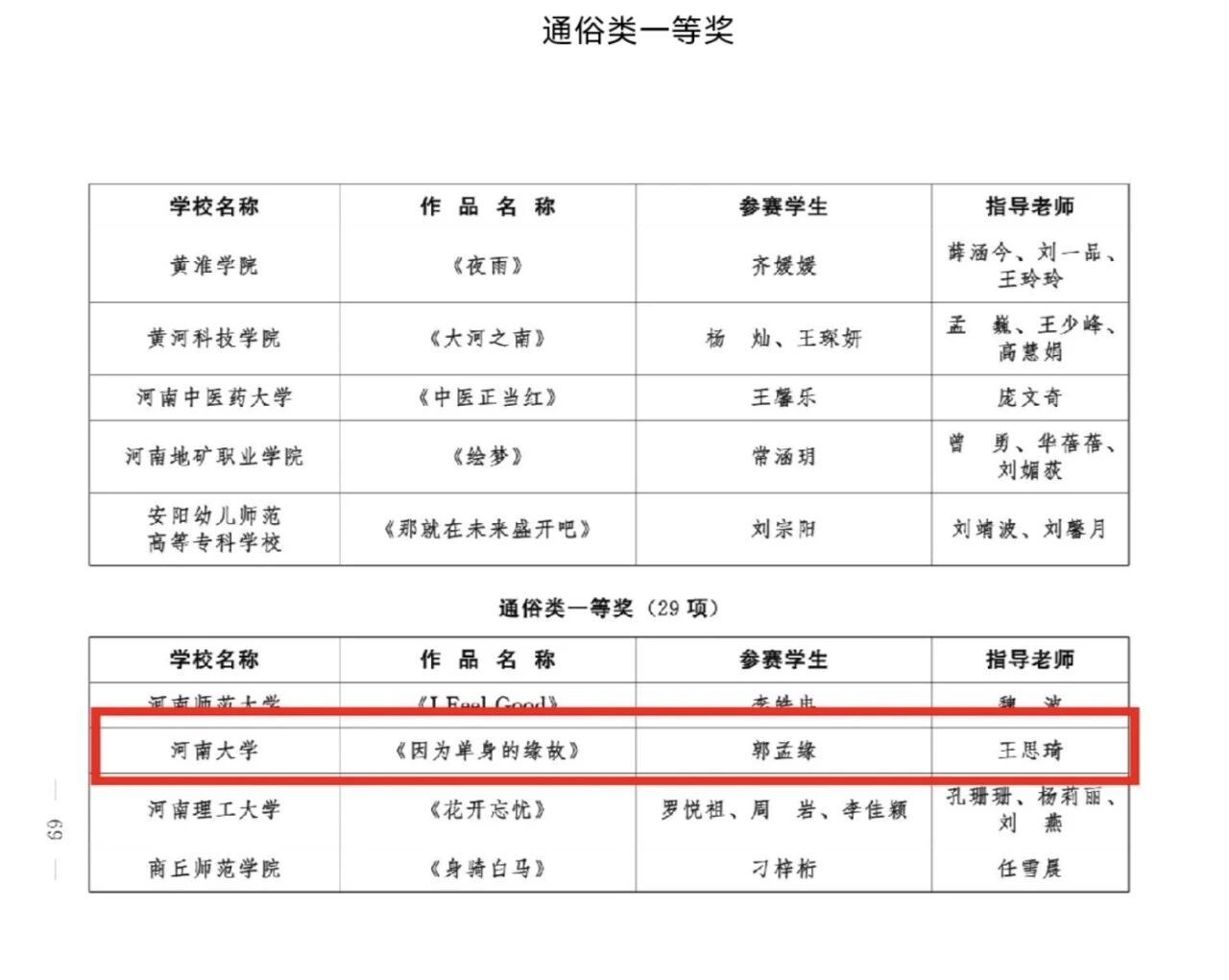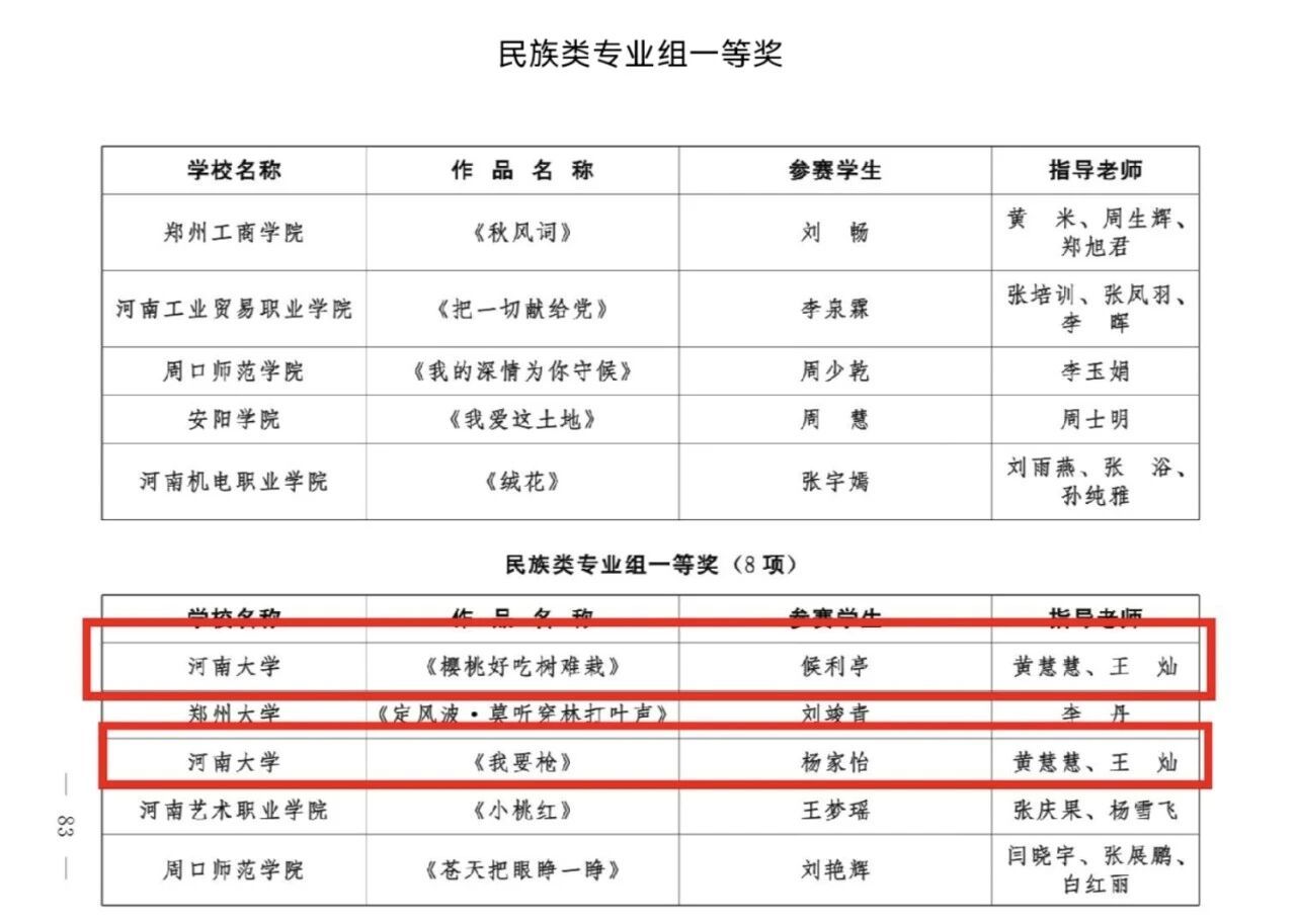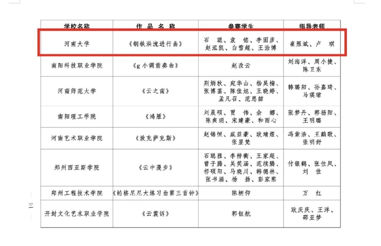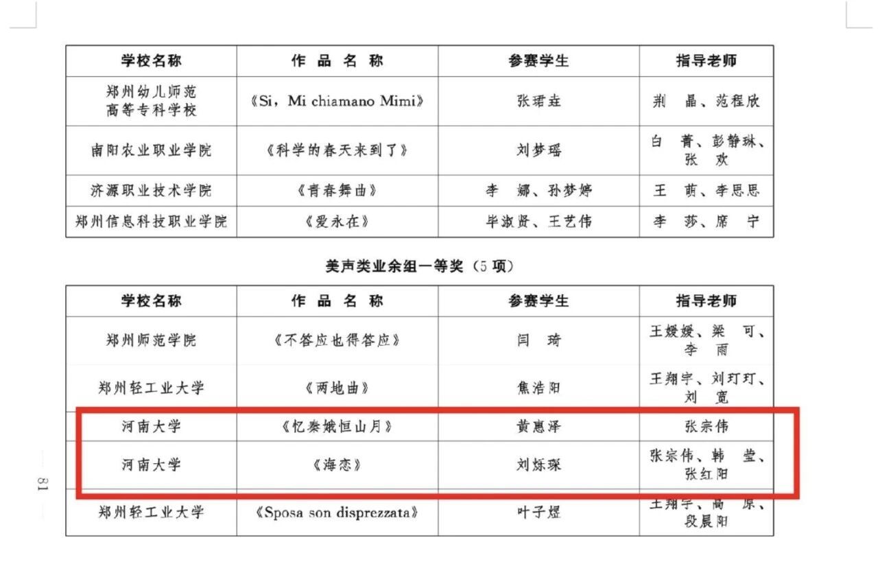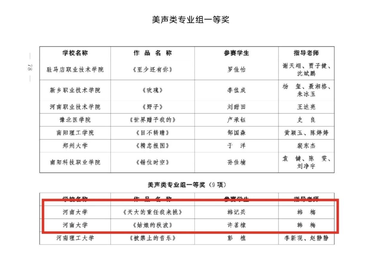 河南省大学生歌手比赛拟获奖名单