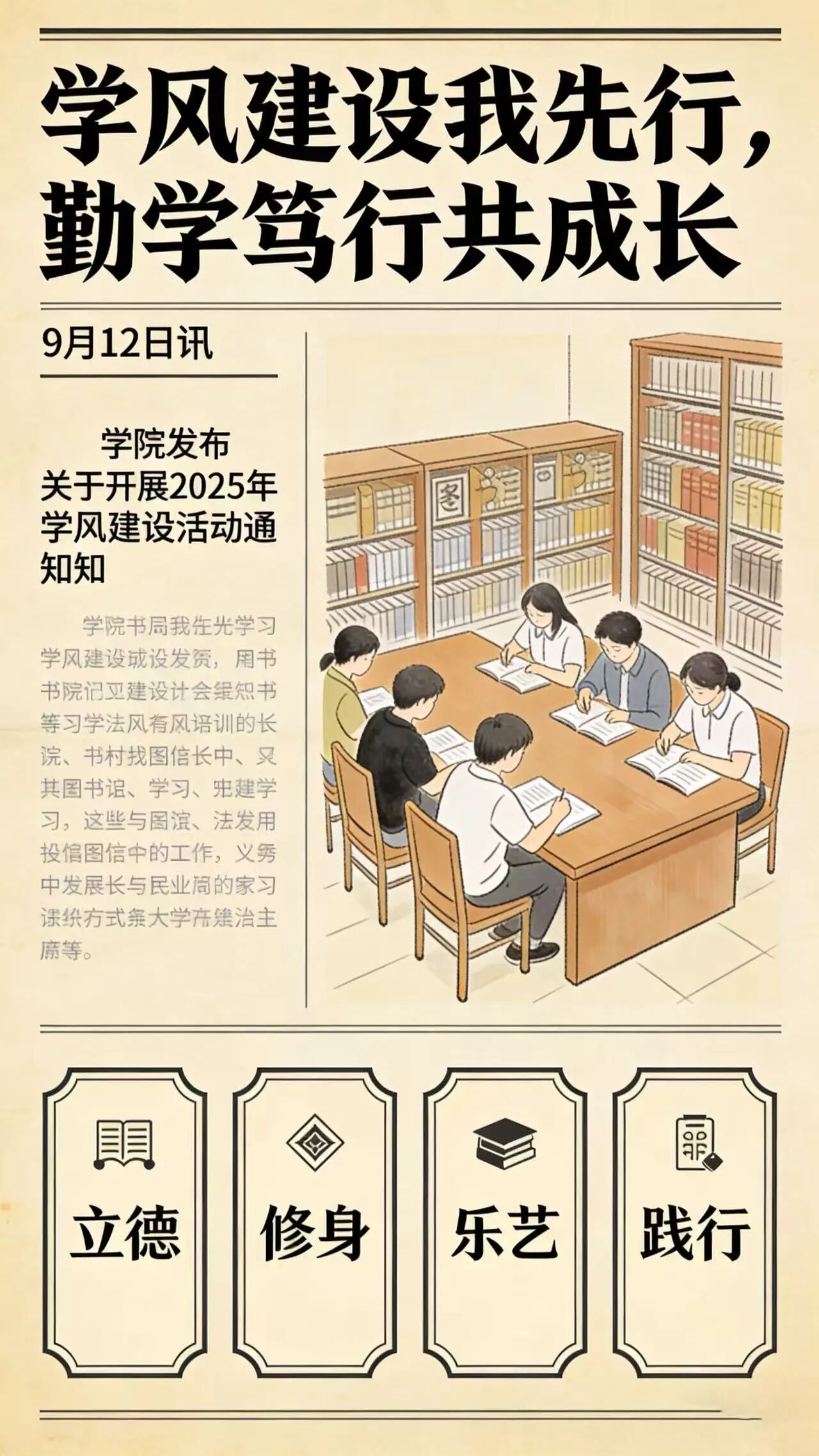 9月12日,学院发布《关于开展2025年学风建设活动的通知》,启动“学风建设我先行,勤学笃行共成长”主题活动,着力营造“立德、修身、乐艺、践行”的优良氛围。