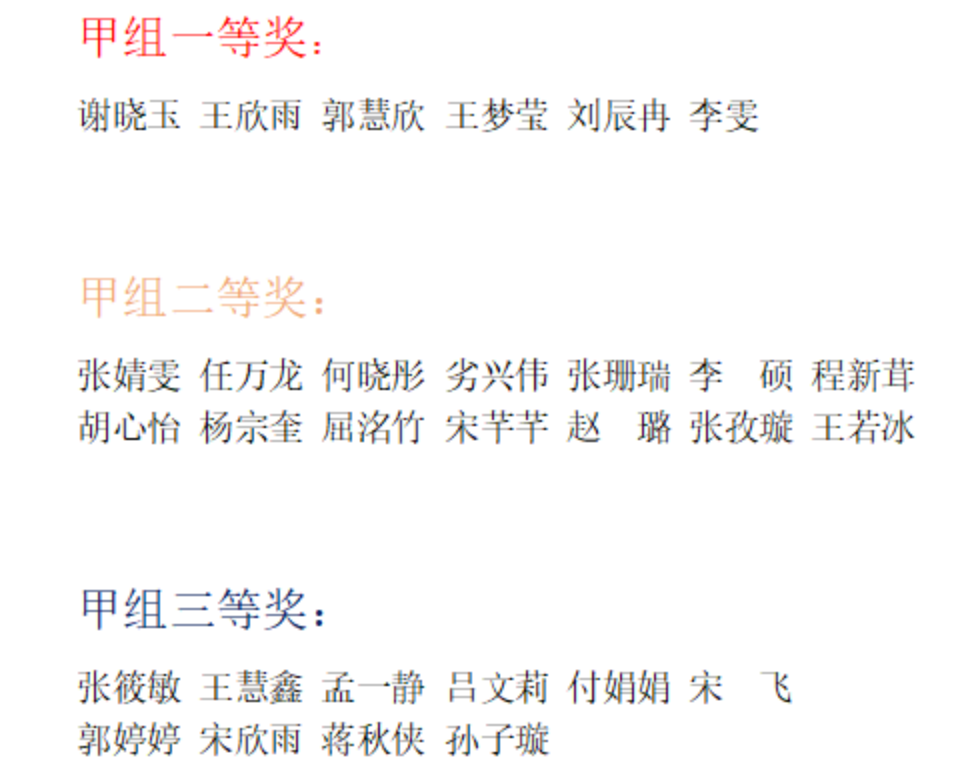 谢晓玉等8名同学荣获一等奖,张婧雯等14名同学荣获二等奖,张筱敏等10名同学荣获三等奖。