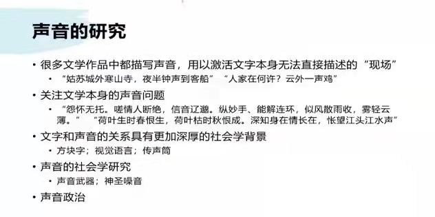 首先,周老师梳理了声音研究的谱系:第一阶段,文学作品中的声音描写;第二阶段,文学自身的声音问题;第三阶段,文字和声音的关系所具有的社会学背景;第四阶段,声音的社会学研究;第五阶段,声音政治。每一阶段,周老师都结合具体案例进行解说,如诗词、文言文、声音技术等,为在场师生理解声音研究提供了可资借鉴的思路。