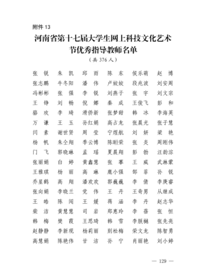 获得河南省第十七届大学生网上科技文化艺术节优秀指导教师名单:侯乐萌、赵博、张志鹏、牛冬阳、潘伟、黄慧慧、司岩、郑慧玲、李蓓、韩梅、樊霞、王思琦、徐芳芳、李玉昆、王聚伍、赵瑞新(按表彰文件顺序排列)。