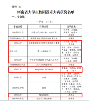 河南省大学生校园器乐大赛,作品《肖斯塔科维奇单簧管长笛钢琴三重奏》《唱支山歌给党听》《<匈牙利狂想曲>第九首八手连弹》《Maxglaner Reloaded》《魔鬼的诱惑》荣获专业组一等奖。