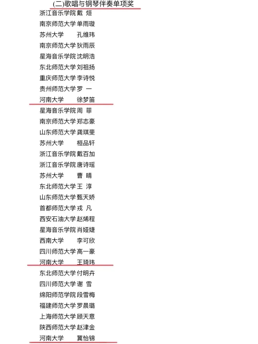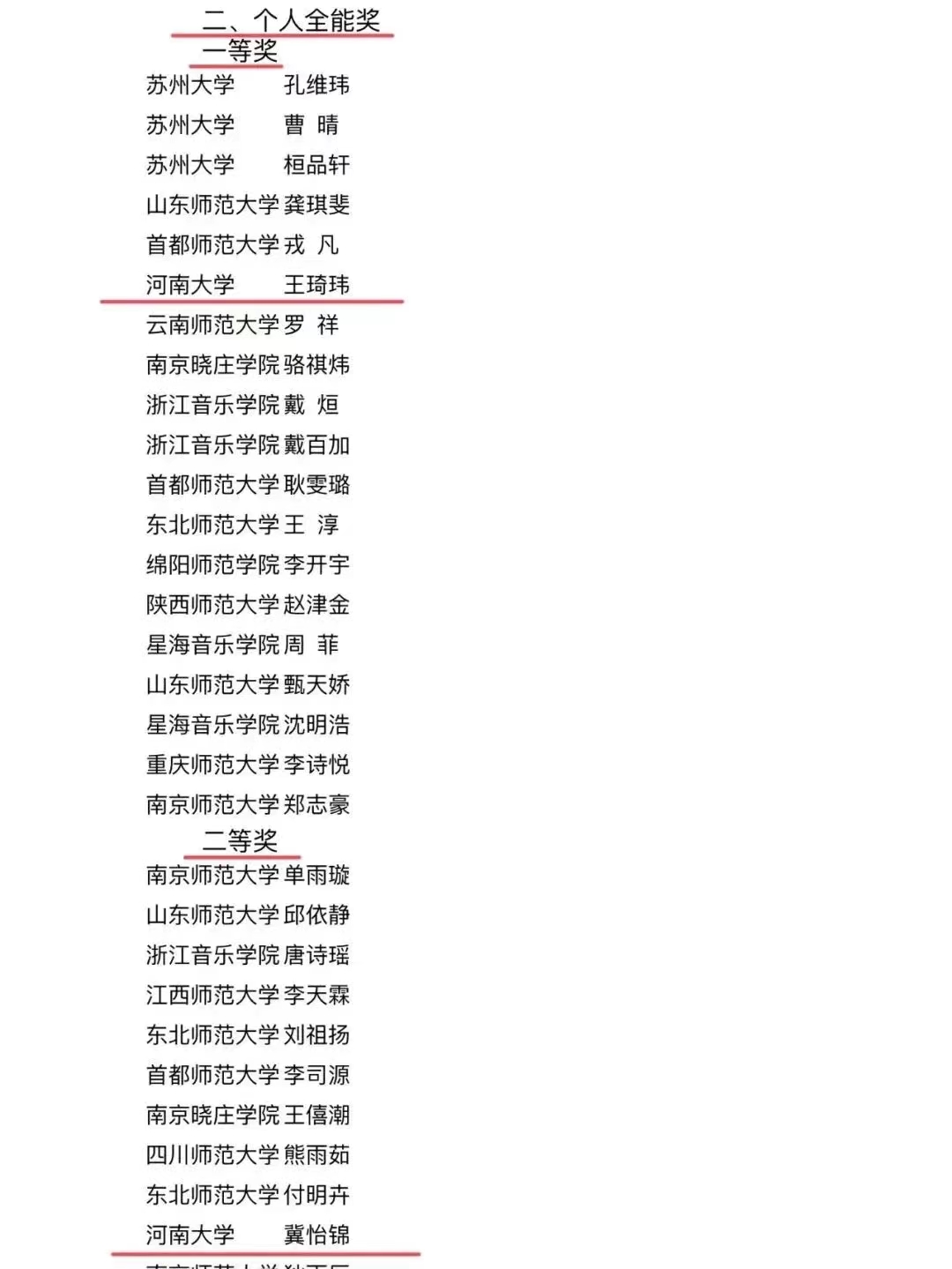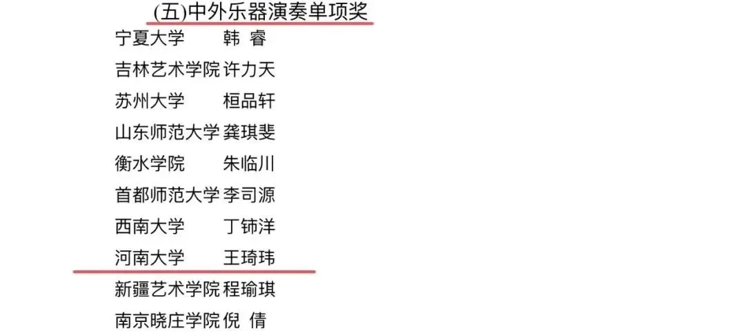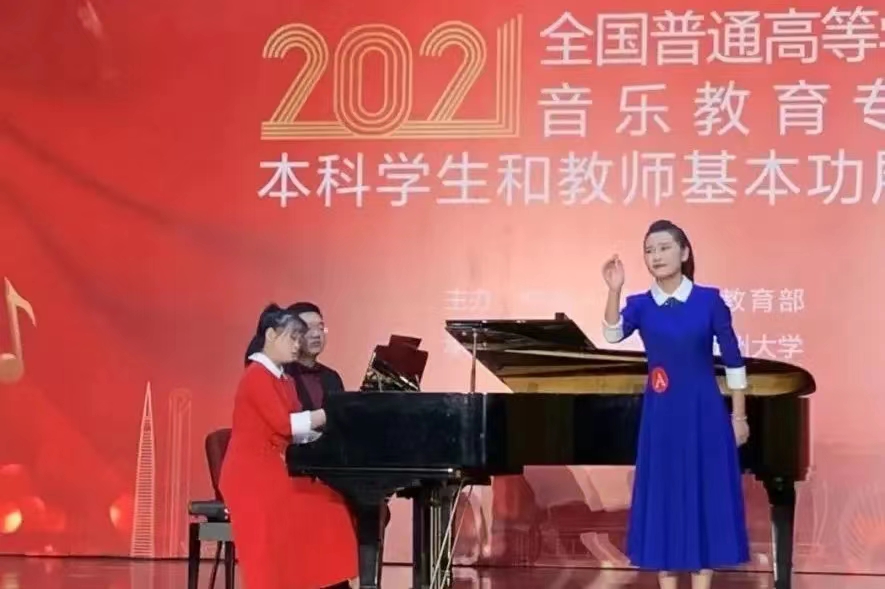 学生王琦玮荣获个人全能一等奖、微课展示单项奖、歌唱与钢琴伴奏单项奖、自弹自唱单项奖、中外乐器演奏单项奖(五项大奖)。学生冀怡锦荣获个人全能二等奖、歌唱与钢琴伴奏单项奖、舞蹈展示单项奖(三项大奖)。学生徐梦迪荣获个人全能三等奖、歌唱与钢琴伴奏单项奖(二项大奖)。同时,学生代表队荣获团体总成绩二等奖(77所参赛高校排名第九)。