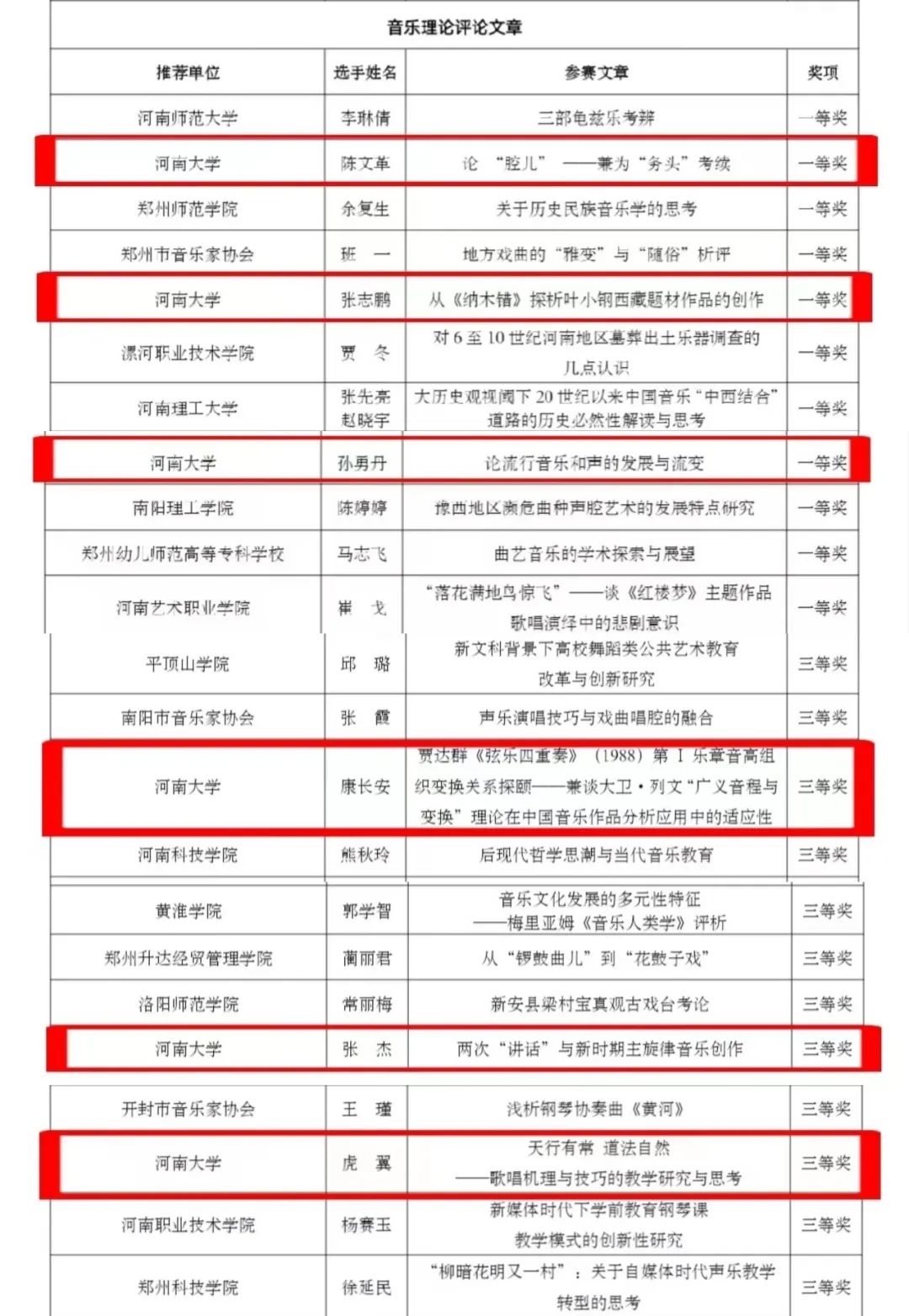 教师陈文革、张志鹏、孙勇丹、康长安、张杰、虎翼荣获音乐理论评论组奖项。