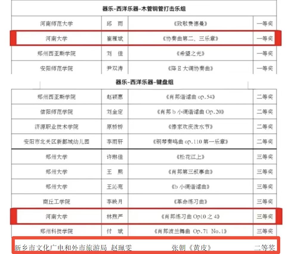 教师康乔瑄、黄紫晨、于亚龙、张玮语、崔雁斌,硕士林煦严、赵珮雯获西洋乐器组奖项。