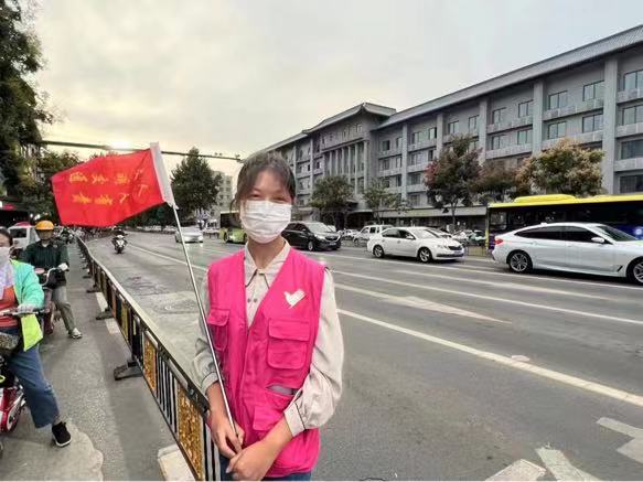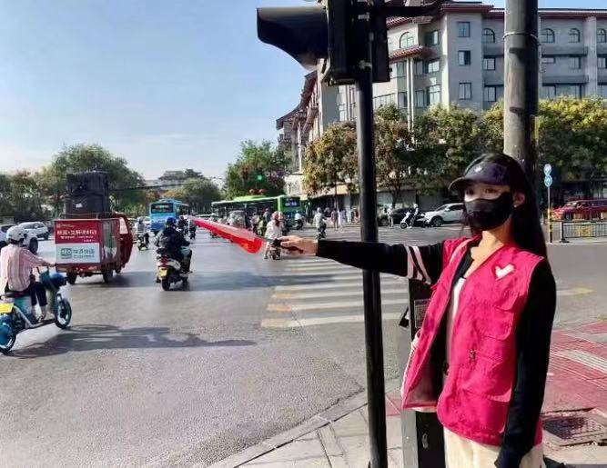 志愿者们身穿粉红马甲,手持“文明交通 让爱先行”交通指挥旗,准时站在东司门交通岗的四个执勤点位,在人行道进行交通劝导,协助交警指挥车辆交通和行人过往,提醒过往车辆减速慢行、礼让行人;耐心劝导行人过马路自觉遵守交通规则,文明出行,制止乱穿马路、逆向行驶、违章带人等不文明行为,赢得过往行人的一致好评,粉红色的身影成为东司门十字岗一道靓丽的风景线。