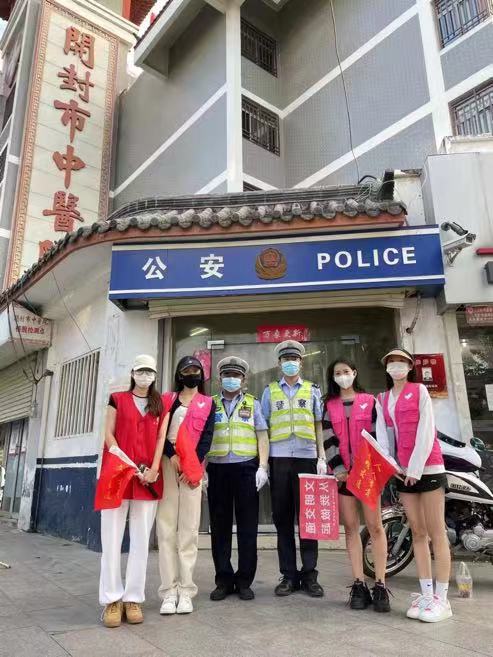 师生志愿者在院团委负责人赵瑞新带领下,到开封市东司门交通岗开展文明交通志愿服务活动,在指定路口协助交警指挥交通,劝阻行人和非机动车辆的不文明行为。