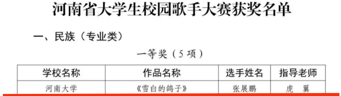 河南省大学生校园歌手大赛(民族类)《雪白的鸽子》荣获一等奖。《沂蒙山永远的爹娘》荣获三等奖。河南省大学生校园歌手大赛(通俗类)《保留》荣获一等奖。《引路的风筝》荣获二等奖。校园歌手大赛(美声组)《你是我心中的一切》荣获一等奖。《人世间》《黄河颂》荣获二等奖。校园歌手大赛(原创类)《想对您说》荣获二等奖。