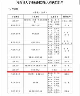 在河南省第十八届大学生科技文化艺术节中,由支部书记吕华指导2020级本科生冯新浩演奏的中国经典钢琴作品《百鸟朝凤》,荣获器乐专业组一等奖,吕华荣获优秀指导教师。