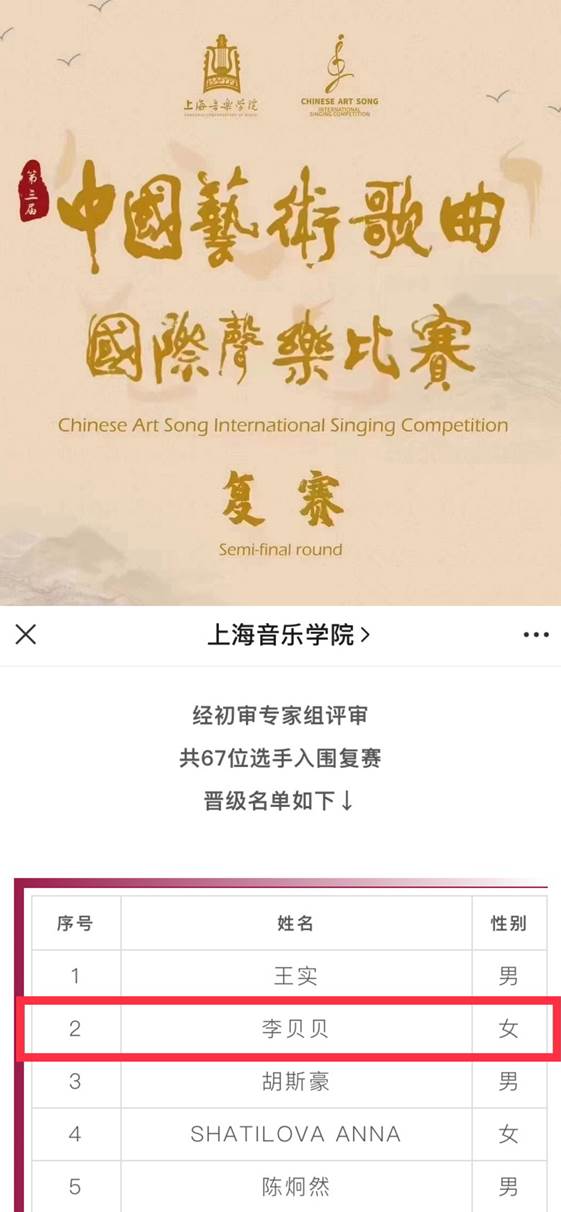 支部党员李贝贝同志入围第三届《中国艺术歌曲国际声乐比赛》复赛