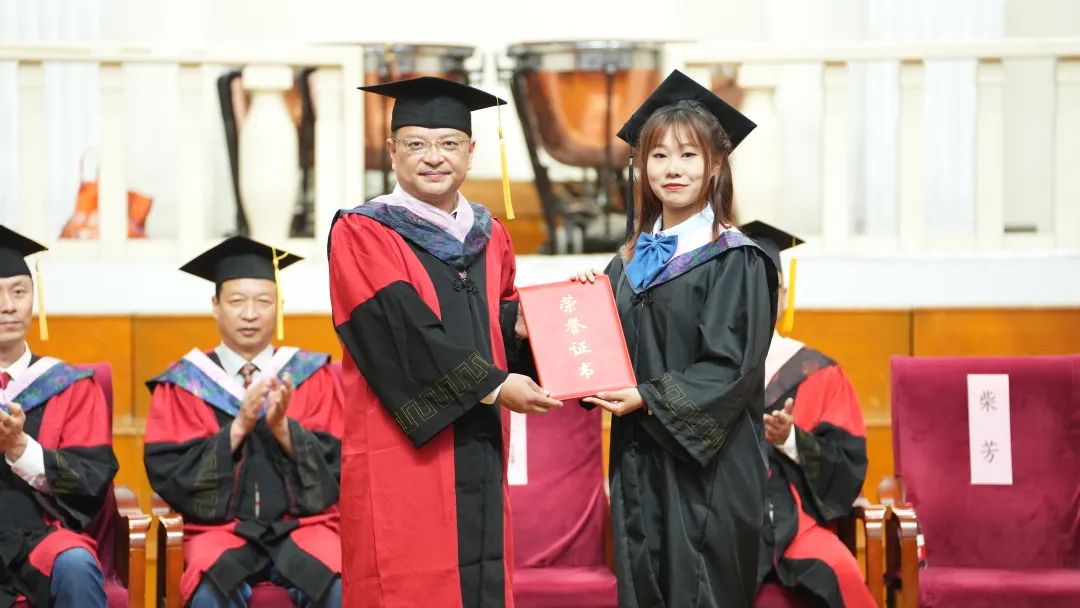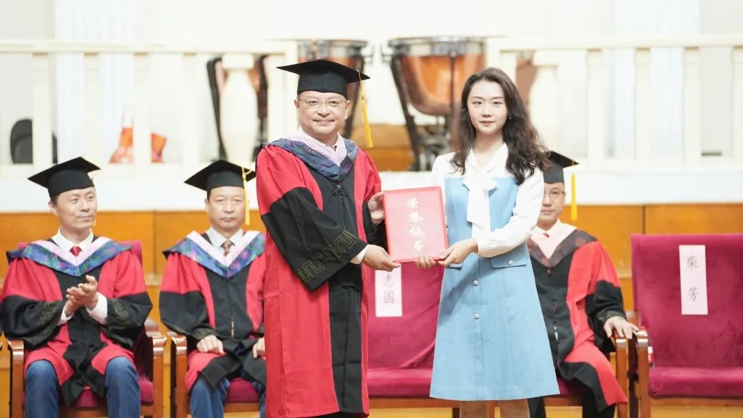 国产AV 副院长王聚伍宣读《国产AV 2023届本科毕业生学士学位授予决定》。受校长张锁江委托,院长王思琦逐一为本科生援正流苏颁发毕业证书并合影留念。