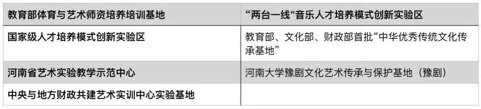学院4个本科专业均为河南省一流本科专业建设点;音乐学、音乐表演、表演3个专业为国家级一流本科专业建设点。音乐与舞蹈学、戏剧与影视学2个一级学科是河南省重点学科;艺术硕士评为河南省首批专业学位特色品牌授权点,是河南省唯一具有学士、硕士、博士完整培养体系的院校。