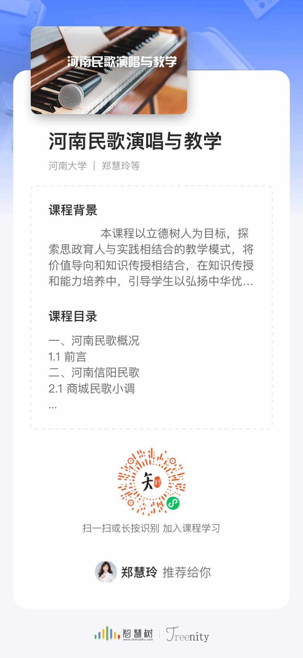 河南民歌是中华优秀传统文化的组成部分,是中原音乐文化的重要体现。由于种种原因,河南民歌的受关注度在减弱,其传播和传承面临困境。本课程通过将多种体裁和多样化演唱形式的河南民歌融入教学实践,希望更多人了解河南民歌、学习河南民歌,推动河南民歌得到进一步传承与保护。