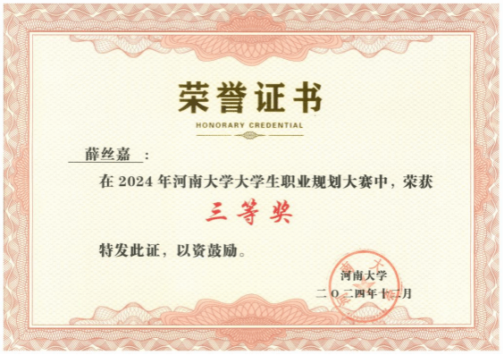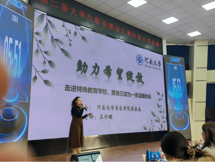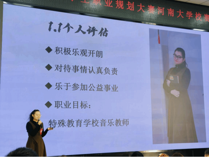 薛丝嘉同学通过与一位盲女机缘巧合的相识,从组织支持她上大学的募捐活动,到了解是多个音乐教师帮助她考上心仪的大学,关注她求学的艰辛与成就。薛丝嘉始终秉承“从一个人的明德,到更多人的至善”的理念,沉静剖析自我,深挖兴趣潜能,明晰自己的做一名音乐教师的职业理想,依据对专业的理解,以及所了解的目标职业特点,详细制定特殊教育音乐教师的职业规划方案。为了对目标职业充分了解和评估,对目标行业进行了实地考察,了解目标职业的就业环境和就业要求,以及就业职位所需要的特殊技能。从自我认知步步延展,规划实施路径,制定学习储备相关知识和技能的计划,悉心考量调整策略,全方位呈现出一份扎实可行的职业规划,最终以优异表现荣获三等奖,获得评委高度评价。