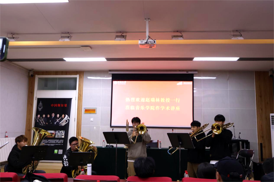 公开课的最后环节,由赵瑞林教授指导学生进行铜管室内乐重奏。低音铜管专业学生分别演奏了三首室内乐作品,赵瑞林