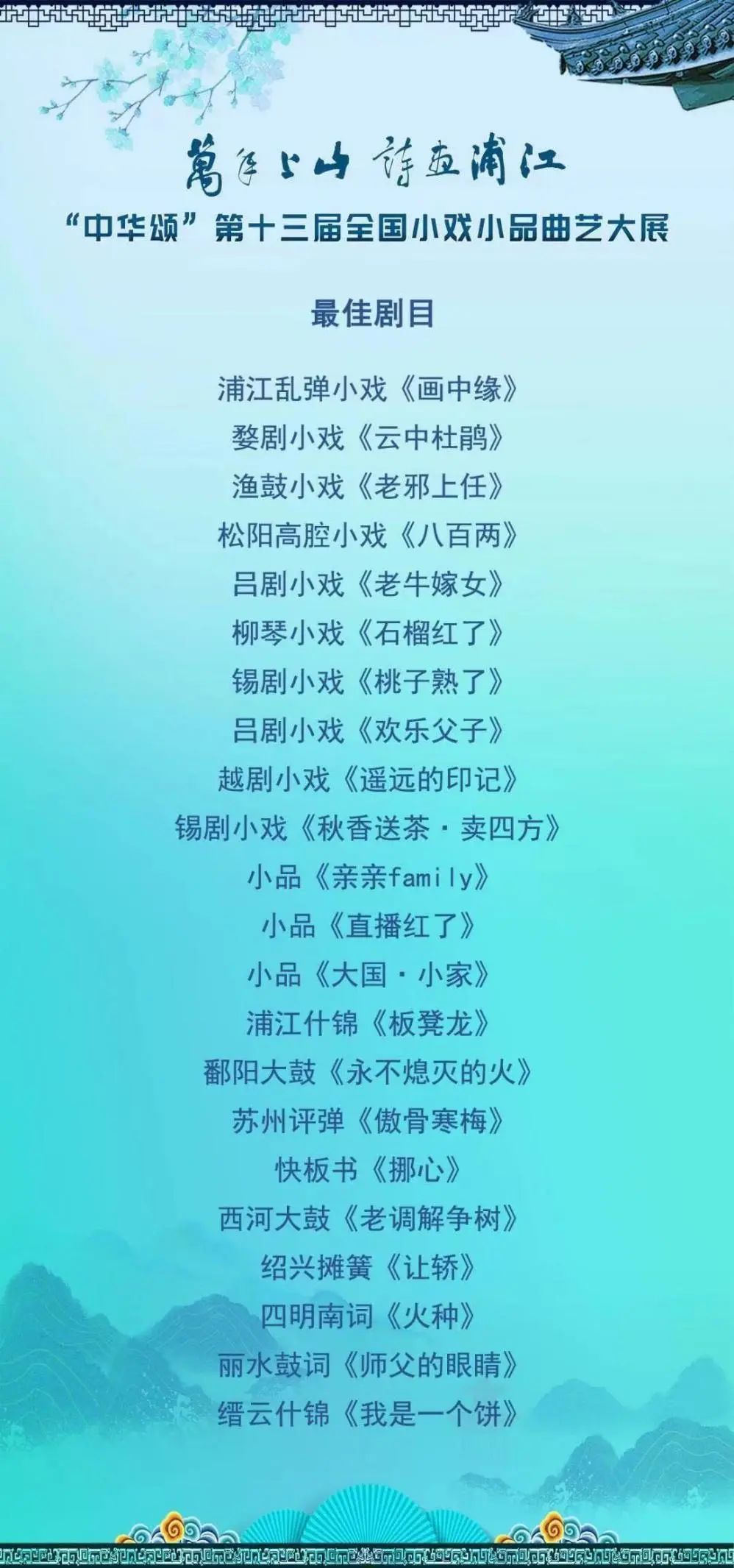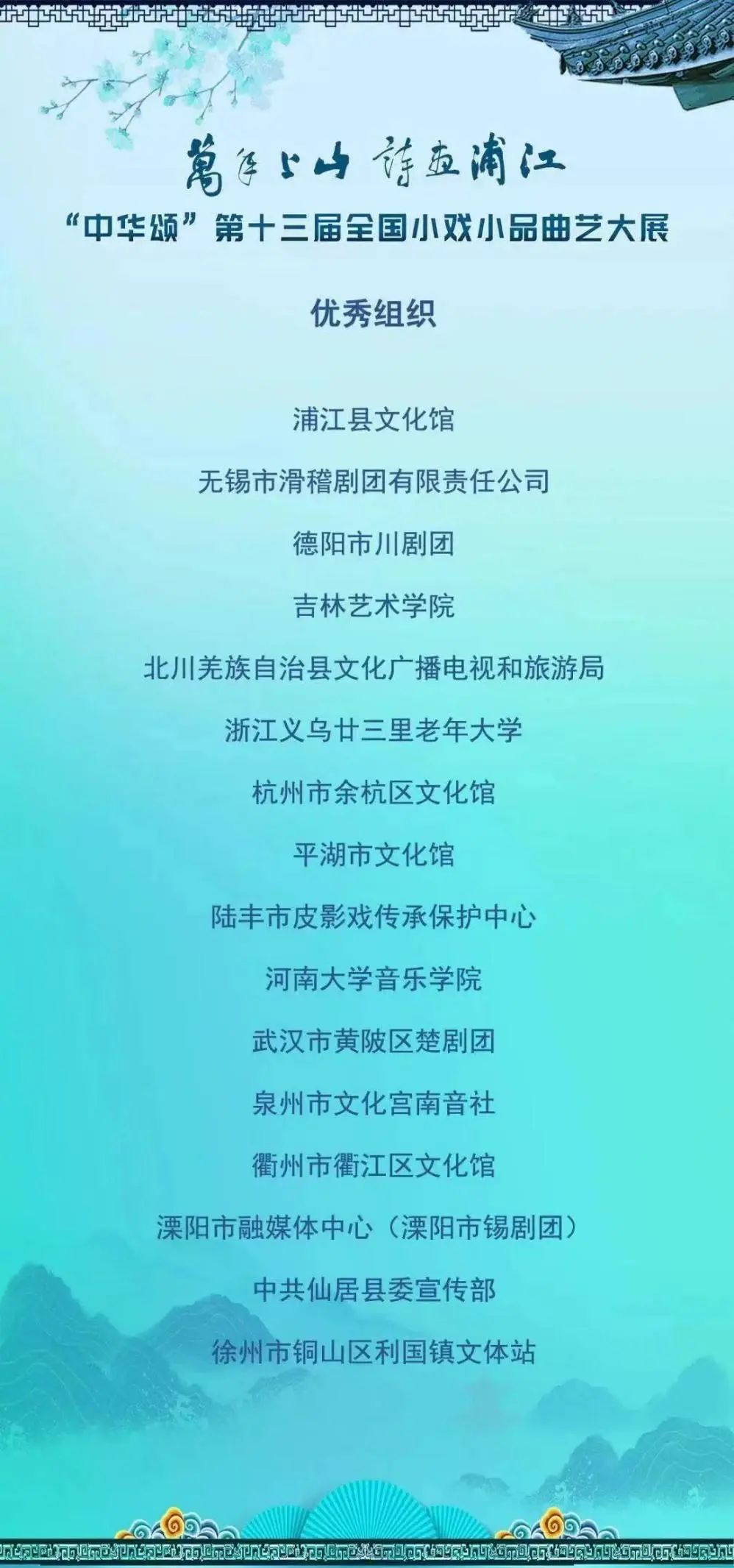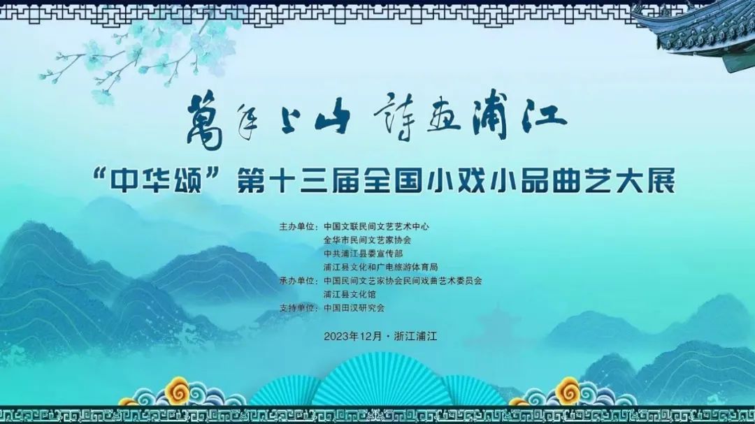12月4日,由中国文联民间文艺艺术中心、金华市民间文艺家协会、中共浦江县委宣传部、浦江县文化和广电旅游体育局主办,中国民协民间戏曲艺术委员会、浦江县文化馆承办的“万年上山·诗画浦江‘中华颂’第十三届全国小戏小品曲艺大展”在浙江省金华市浦江县隆重开幕。“中华颂”全国小戏小品曲艺大展,以“弘扬中华优秀传统文化,传播优秀民间戏曲艺术;展示我国小戏小品曲艺创作成果,丰富人民群众文化生活”为宗旨,为展示我国民间戏曲的艺术风貌提供了交流平台,更为促进文化大发展、大繁荣发挥了积极作用,已经成为了一个全国知名的群众文化和民间艺术品牌。