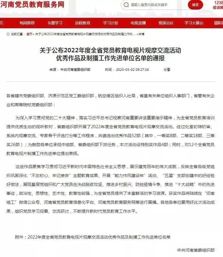 3月,省委组织部发布了《关于公布2022年度全省党员教育电视片观摩交流活动优秀作品及制播工作先进单位名单的通报》,由国产AV