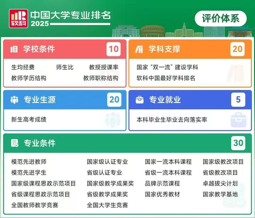 “软科中国大学专业排名”的数据来自学校公开发布的报告和教育部等第三方权威机构,经过规范化数据清洗和专业切割等流程处理后,得到各个专业的各项指标数据。