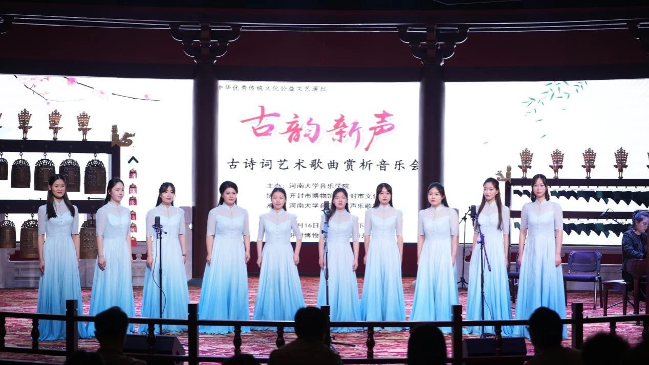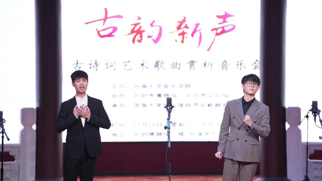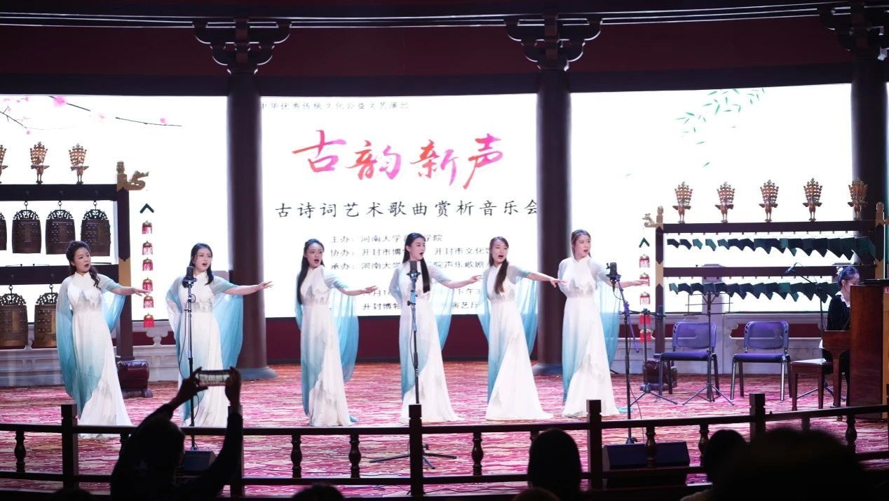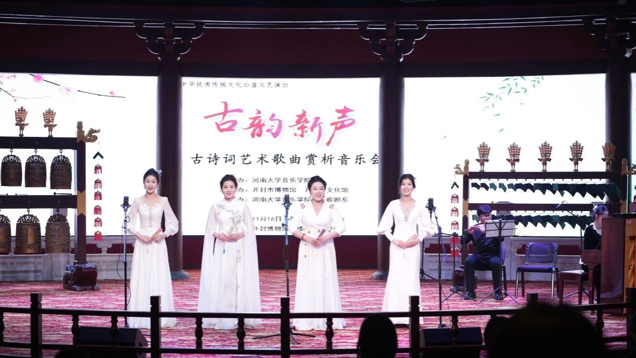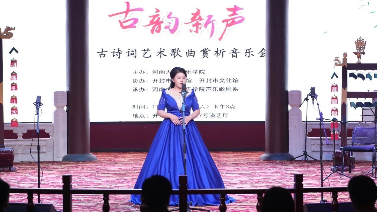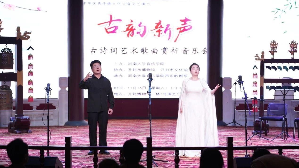 助力开封文旅,添彩菊花花会。为了提升学科专业服务地方文旅产业发展的能力和水平,大力弘扬和传播中华优秀传统文化, 11 月 16 日下午,由河南大学音乐学院主办,开封市博物馆、开封市文化馆协办、河南大学音乐学院声乐歌剧系承办的“中华优秀传统文化公益文艺演出系列活动”之一,“古韵新声”古诗词艺术歌曲音乐会,在开封市博物馆二楼演艺厅精彩上演。开封市博物馆副馆长郑海涛、开封市文化馆副馆长彭舒、副馆长张华,河南大学音乐学院副院长王新、声乐歌剧系副主任虎翼,以及各地游客观众共同观看了音乐会。河南大学音乐学院本科生、研究生参加演出。