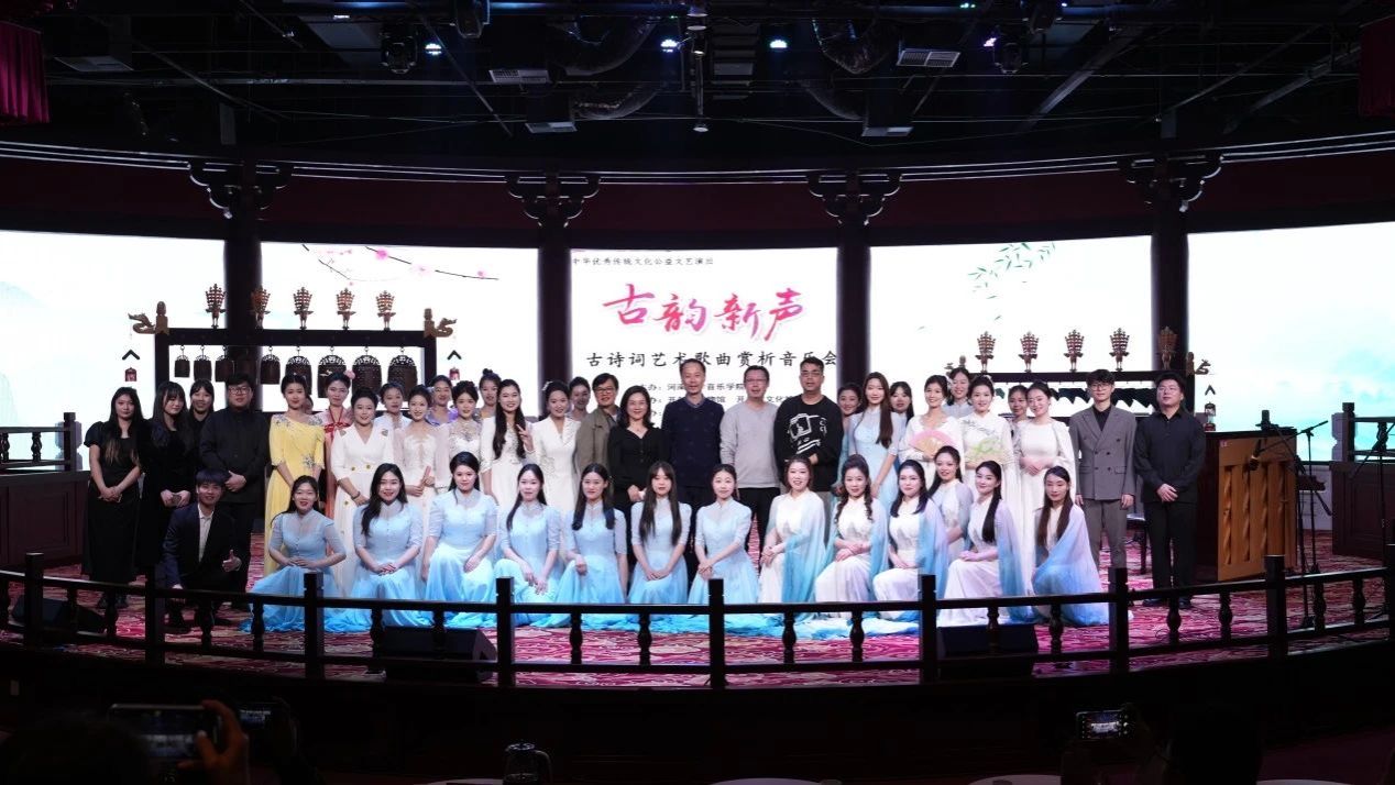 除了宋词,音乐会还涵盖了《别君叹》《琵琶行》《长相思》《青玉案·元夕》《越调小桃红·采莲女》《山之高》等其他唐诗和经典诗词。每一首歌曲都像是一幅古典画卷,在学生们的歌声中徐徐展开,传递出古人面对困境时的豁达与坚韧、日常生活中的百感交集,让观众们沉浸在古诗词与音乐交相辉映的意境之中。