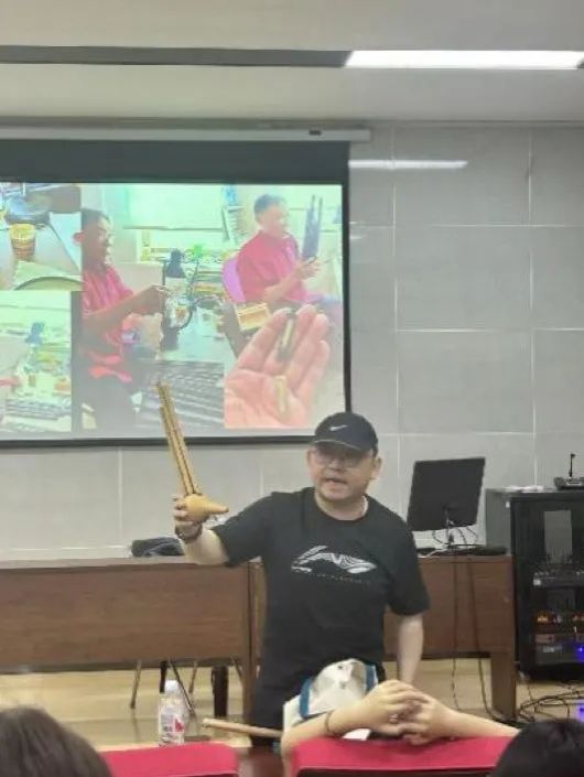 杨琛教授长期致力于研究中国西南少数民族管乐器研究,他认为中国西南少数民族管乐器分布着形制各异的共鸣器,这些共鸣器显著影响着乐器的音色,使其频谱特征向基音、第一泛音或特定高次泛音集中,体现了西南少数民族管乐器对纯音音色的独特倾向。在讲座中,杨教授为师生们展示了多种来自西南不同地区的民族乐器。