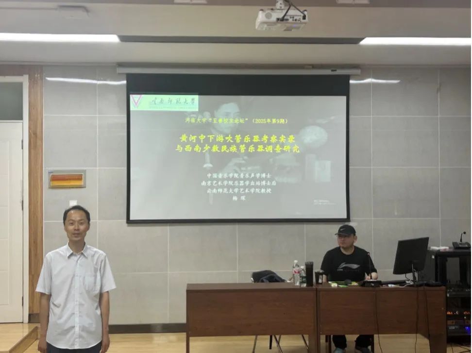 为加强河南大学音乐学院校友与母校的情感联系,为在校生树立学习榜样、拓展学术视野,6月6日上午,音乐学院2003届校友、云南师范大学艺术学院杨琛教授做客至善校友论坛,在学术报告厅作题为“黄河中下游吹管乐器考察实录与西南少数民族管乐器调查研究”的专题讲座。讲座由音乐学院副院长王新主持,省特聘教授陈文革教授、音乐理论系主任康长安副教授,部分学院师生参加讲座活动。