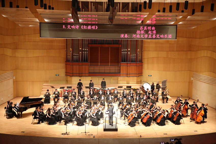 始终与时代同呼吸,与祖国共命运。开场曲目《我的祖国》以民族管弦乐的形式表达了河大人对祖国的真挚热爱,现场观众无不动容。歌曲《在希望的田野上》热情讴歌神州大地的伟大变革与亿万人民锐意开拓的精神。一条路架起中国与世界的桥梁,一条路打开繁荣与希望的大门,民族管弦乐《丝绸之路》时而低沉婉转,时而高亢激昂,让观众在具有东方神秘气息的音乐世界中感受丝绸之路的壮丽与辉煌。一曲《在那桃花盛开的地方》则将人们带入山青水秀的乡村与雪花飞舞的边疆,展现和平宁静的美丽中国。