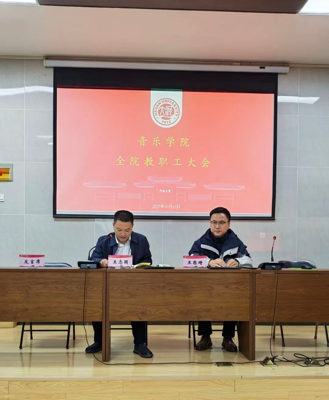 10月16日下午,音乐学院在学术报告厅召开2025年秋季学期全体教职工大会,传达学校会议精神,谋划新学期学院重点工作。会议由学院党委书记王志国主持。全体教职工参加会议。