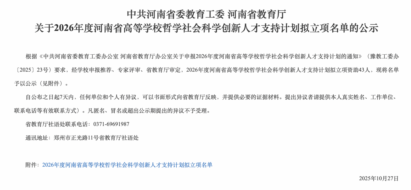 据悉,河南省高校哲学社会科学创新人才支持计划旨在深入贯彻落实《教育强国建设规划纲要(2024—2035 年)》,是一项着力培养豫派哲学社会科学中青年英才、加强高校哲学社会科学高层次人才队伍建设的专项支持计划。该计划重点支持高校优秀人才围绕学科前沿、社会需求以及哲学社会科学关键问题开展创新性研究,力争在重点领域取得具有标志性的成果,从而全面提升高校的人才培养质量、创新能力与核心竞争力。