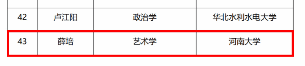 近日,河南省教育厅公布了“2026年度河南省高等学校哲学社会科学创新人才支持计划”拟立项名单,经个人申报、学校推荐、专家评审、省教育厅审定,本次计划拟立项资助43人,河南大学有8人入选。河南大学音乐学院青年教师薛培副教授,继今年8月入选“河南省本科高校青年骨干教师”培养计划后,再次入选“河南省高等学校哲学社会科学创新人才”支持计划。
