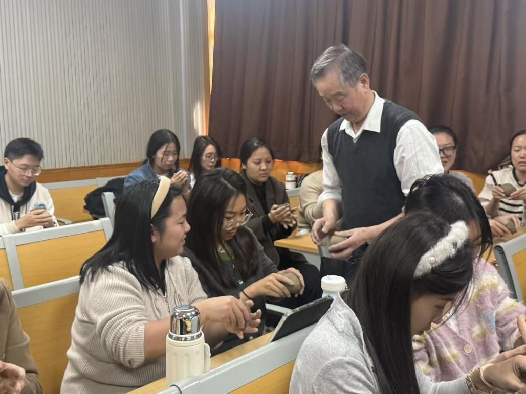 当天下午,陈秉义教授到音乐学院教室,为同学们带来了一场生动的音乐考古实践课,揭开陶埙制作的神秘面纱。陈教授首先为同学们细致讲解了陶埙制作的理论知识与注意事项,并结合自身多年实践经历,回顾了自己从入门到精通陶埙制作的学习历程。随后,陈教授通过“手工捏塑”与“工具辅助”两种不同方法,完整演示了陶埙的制作全过程。从陶泥的品质筛选,到埙体的塑形、精细打磨,再到音孔的定位、开孔,反复调音,每一个步骤都耐心拆分讲解,对学生进行手把手示范指导。