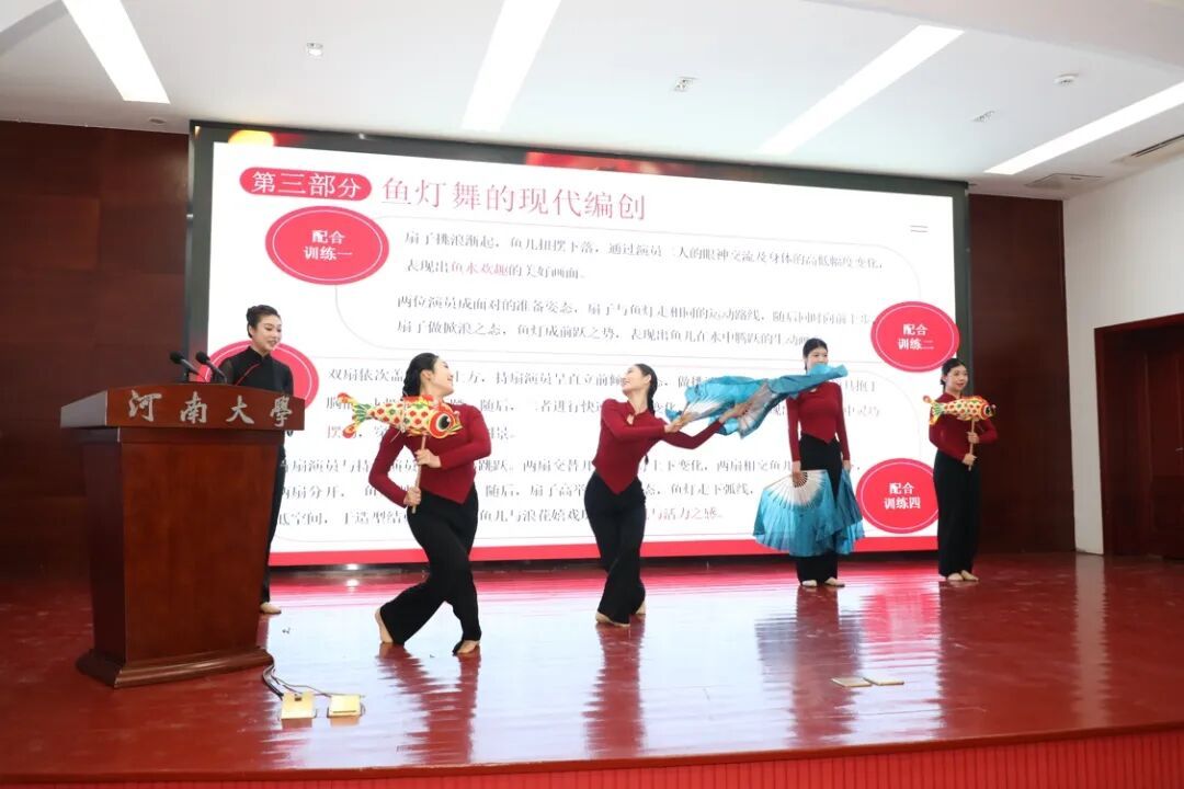 河南大学音乐学院舞蹈编导专硕研究生贾溯宁、司雨、陈昱彤主讲的《鱼灯豫韵——河南传统民间舞蹈鱼灯舞的道具配合性训练》,以河南民间传说为背景,生动讲述鱼灯舞的起源与风格,巧妙融合扇子与鱼灯,感受发力逻辑与运动轨迹,赋予“水”与“游鱼”的意象表达。团队创新探索了道具手位与握法,结合传统阵型,强化道具间的联动配合,具象呈现“游鱼戏水”的灵动场景。