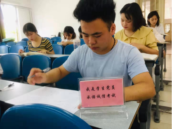 一贯高度重视考风考纪建设,本学期继续加大了考风考纪的宣传力度,进一步端正考风,严肃考纪。由我院党委副书记党鸿军组织安排,为集中体现学生党员与学生干部的示范引领作用,特别为他们制作了诚信考试承诺牌,要求在考试中“持证上岗”,亮出诚信考试态度,成为本学期期末考试一道亮丽的风景线。