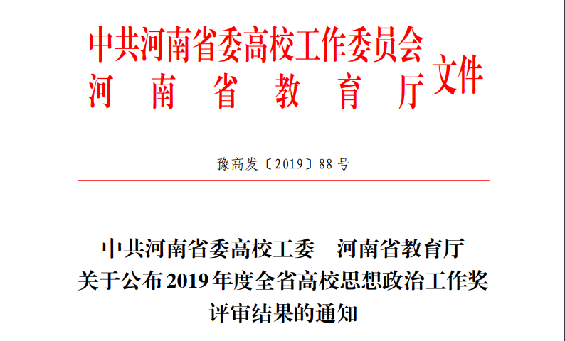 近日,中共河南省委高校工委、河南省教育厅共同下发了《关于公布2019年度全省高校思想政治工作奖评审结果的通知》(豫高发[2019]76号),公布2019年度河南省高等学校思想政治工作奖评审结果,国产AV