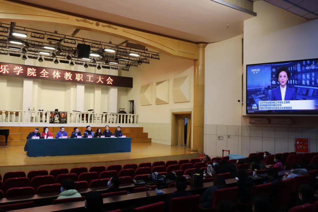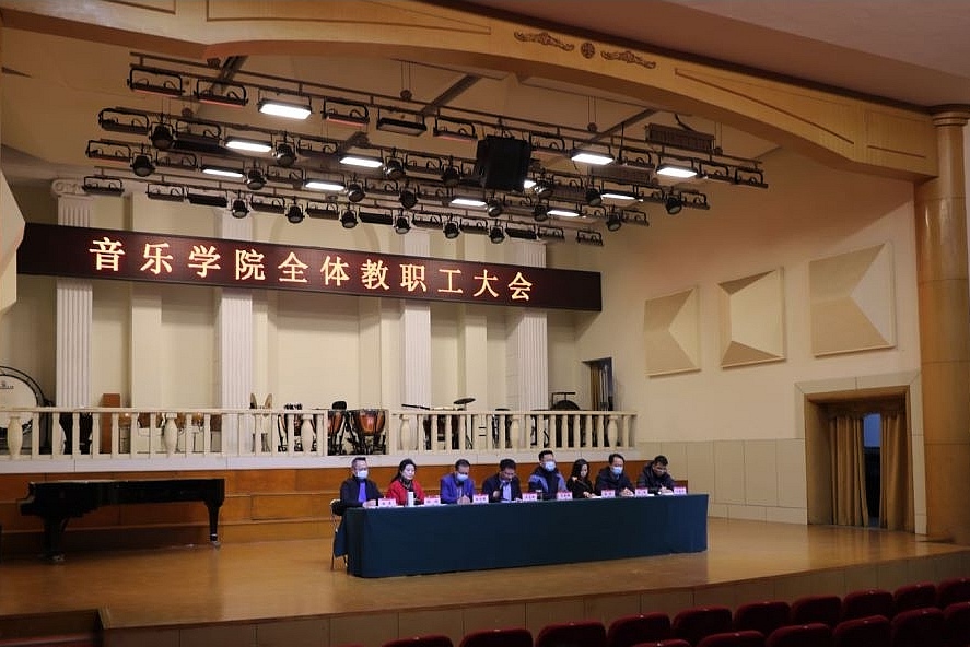 在音乐厅召开全体教职工大会,院党政领导班子成员及全体教职工参加了会议。会议由学院党委书记王志国主持。