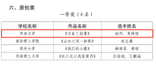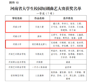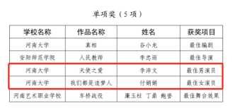河南省大学生校园短剧曲艺大赛,作品《天使之爱》《我们都是追梦人》双双荣获一等奖和单项奖。