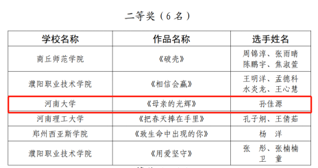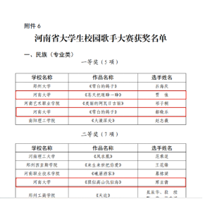 河南省大学生校园歌手大赛,作品《雪白的鸽子》《苍天把眼睁一睁》荣获民族(专业类)一等奖,《狠似高山仇似海》荣获民族(专业类)二等奖;《橘子》荣获通俗类一等奖;《我爱这土地》《漫步街上》荣获美声(专业组)一等奖,《鸟儿在风中歌唱》荣获美声(专业组)二等奖;《为自己鼓掌》荣获原创类一等奖,《母亲的光辉》荣获原创类二等奖。