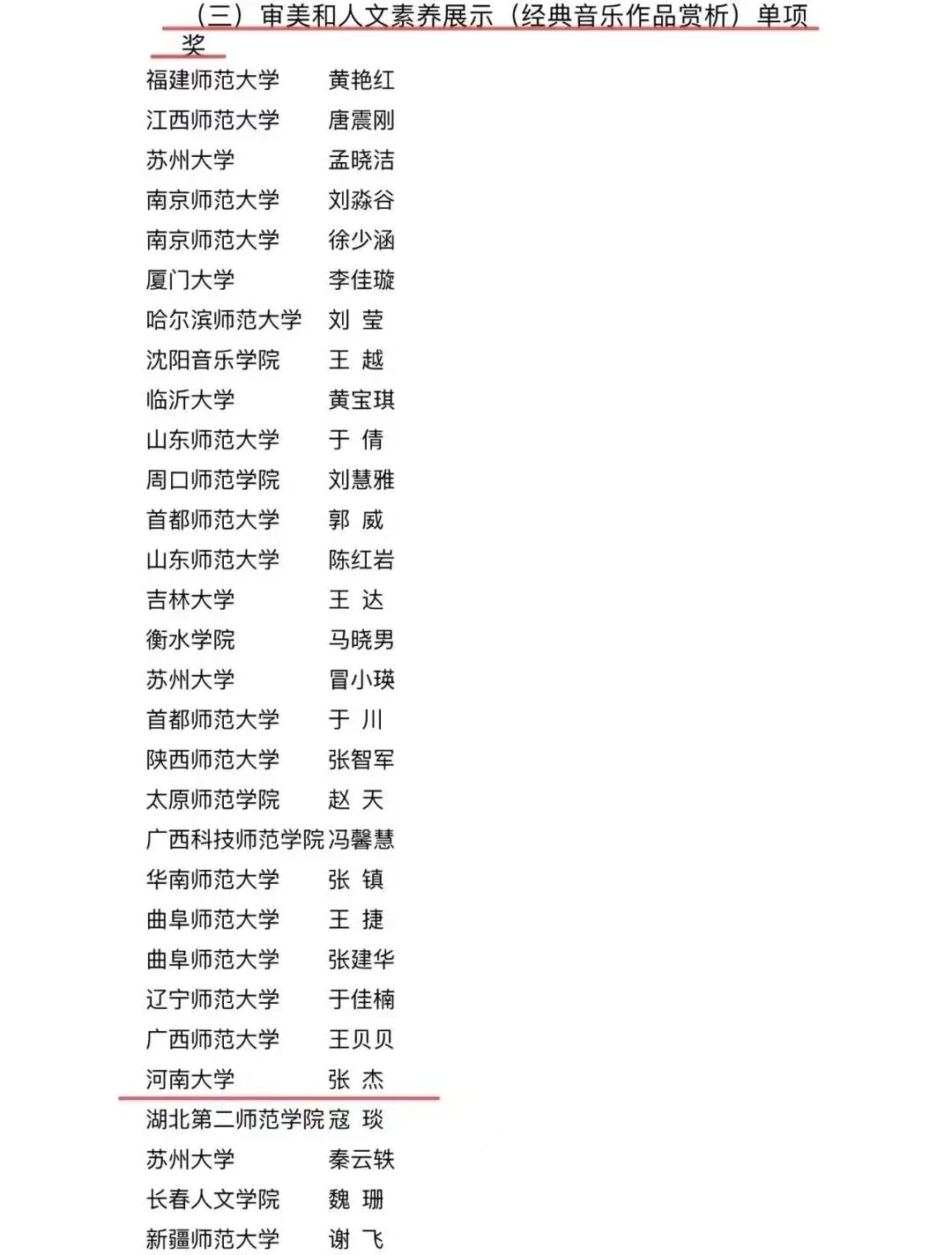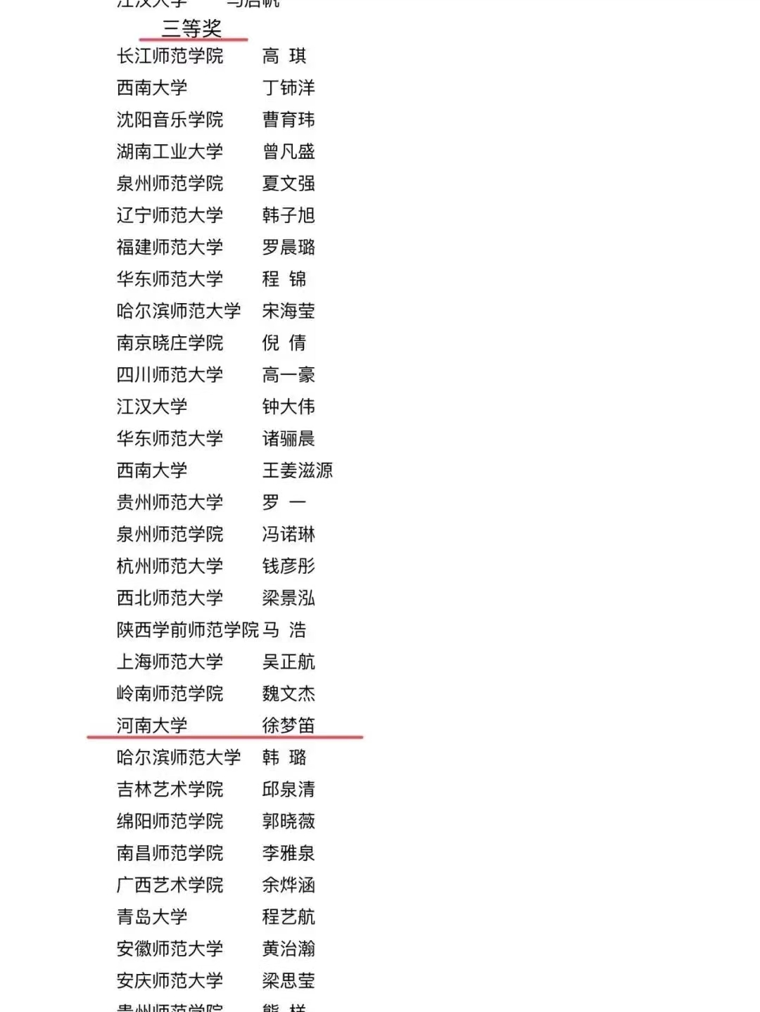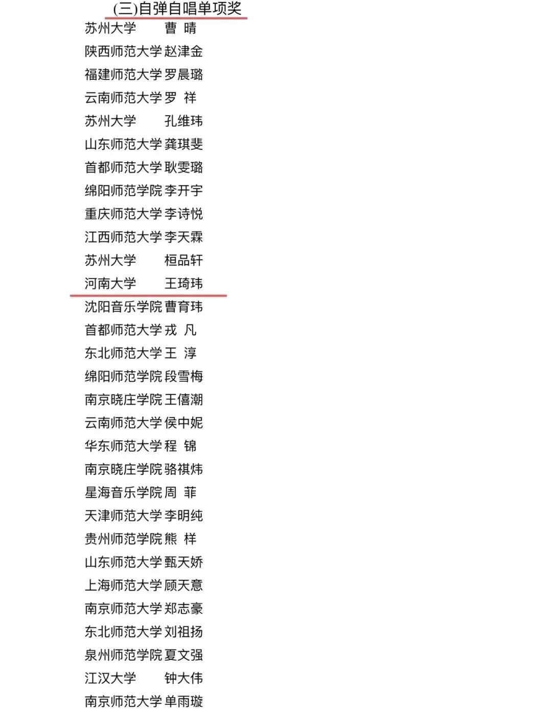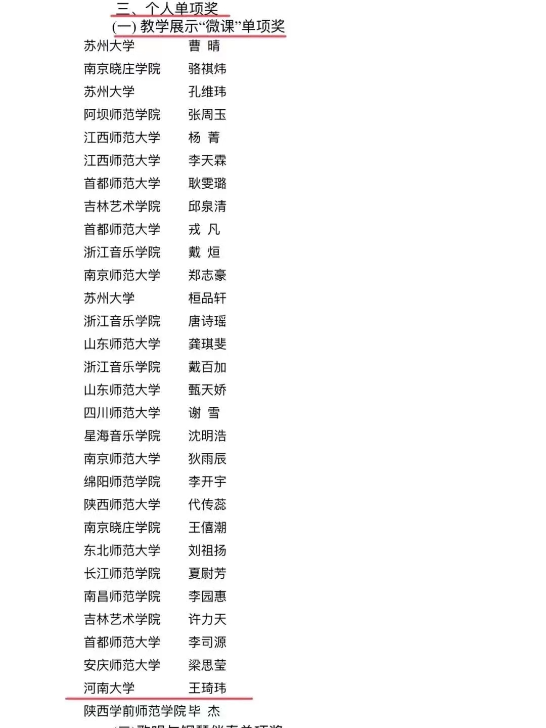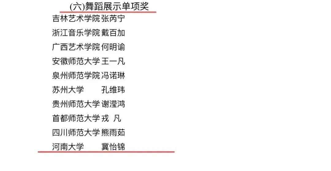学生王琦玮荣获个人全能一等奖、微课展示单项奖、歌唱与钢琴伴奏单项奖、自弹自唱单项奖、中外乐器演奏单项奖(五项大奖)。学生冀怡锦荣获个人全能二等奖、歌唱与钢琴伴奏单项奖、舞蹈展示单项奖(三项大奖)。学生徐梦迪荣获个人全能三等奖、歌唱与钢琴伴奏单项奖(二项大奖)。同时,学生代表队荣获团体总成绩二等奖(77所参赛高校排名第九)。