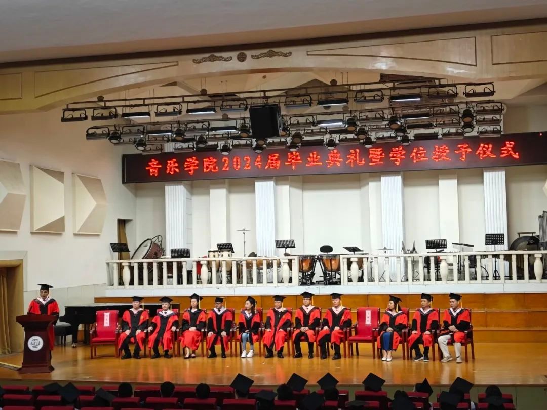 副院长王聚伍宣读 2024 届本科毕业生学士学位授予决定,授予普通本科毕业生:音乐学专业严浩等39位同学艺术学学士学位;音乐表演专业邱雅楠等99位同学艺术学学士学位;舞蹈编导专业卢怡凡等19位同学艺术学学士学位;表演专业任宇航等20位同学艺术学学士学位。共计177人。