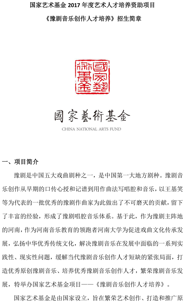 国家艺术基金2017年度艺术人才培养资助项目《豫剧音乐创作人才培养》招生简章