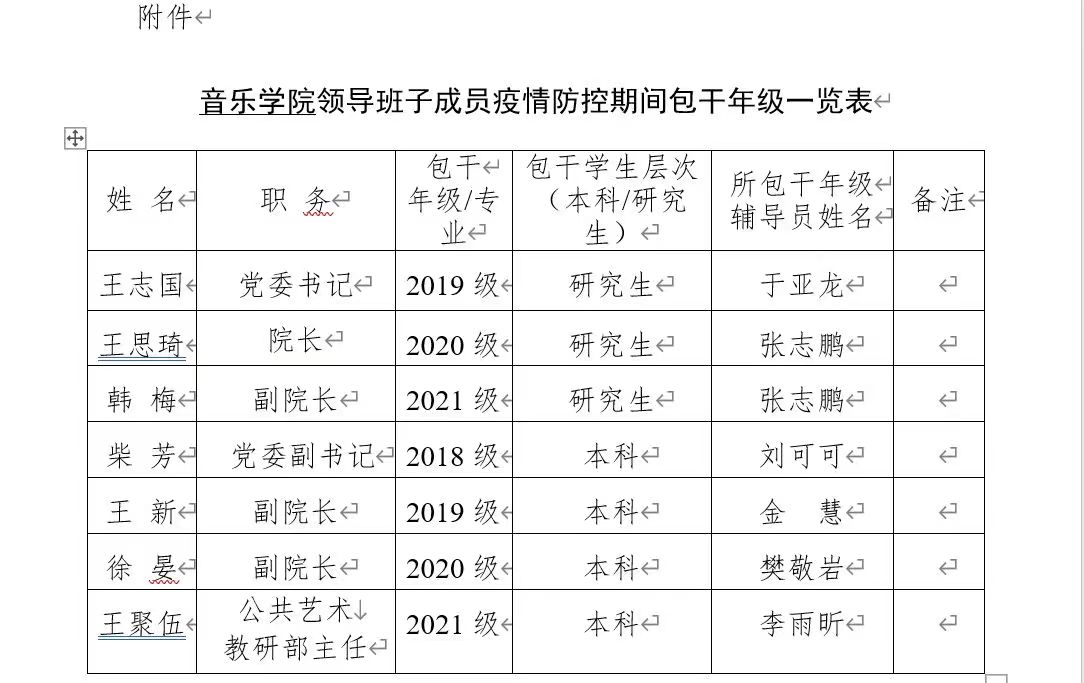 音乐学院领导班子成员疫情防控期间包干年级一览表