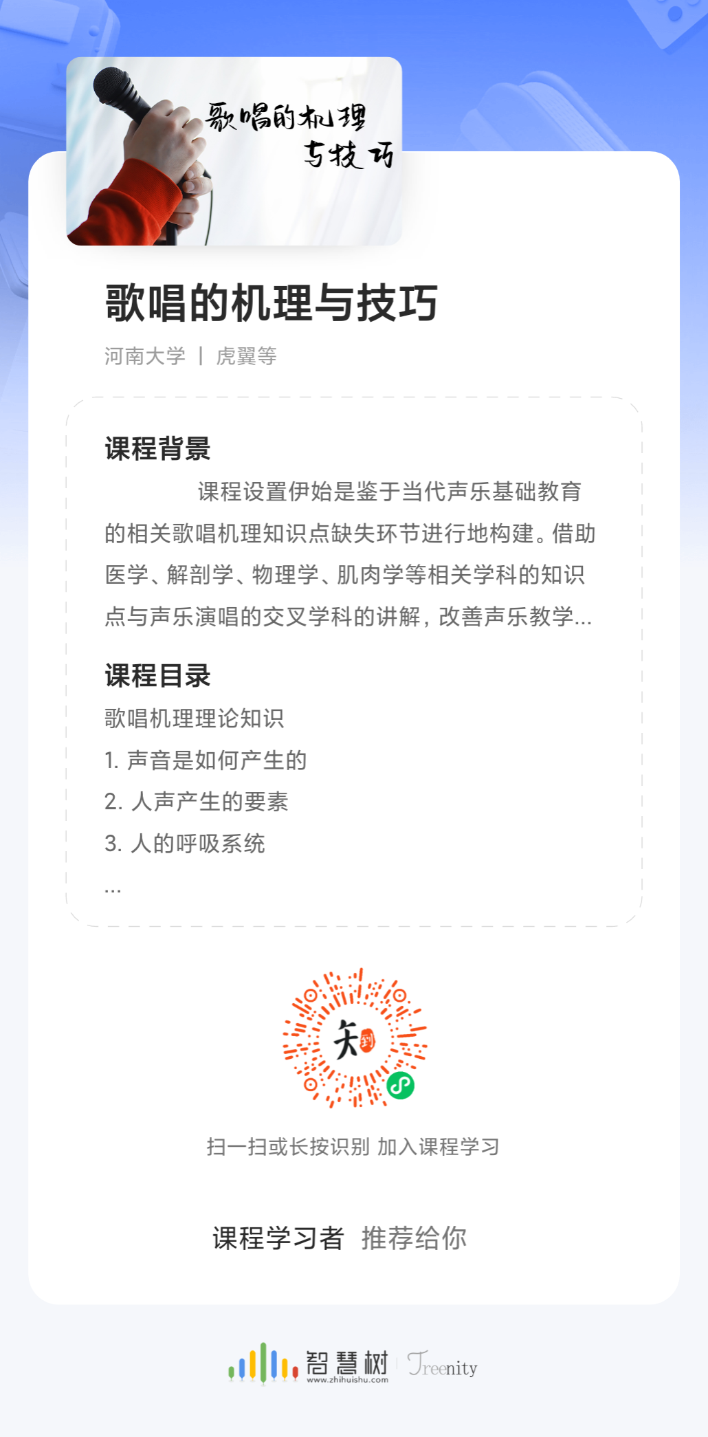 本课程课程目标明确,设计原则多样化,坚持理论与实践相结合。希望虎翼老师这一套网络课程能切实有效的帮助学习声乐,热爱歌唱的同学们,用更自然动听优美的歌声来充实自己的生活!