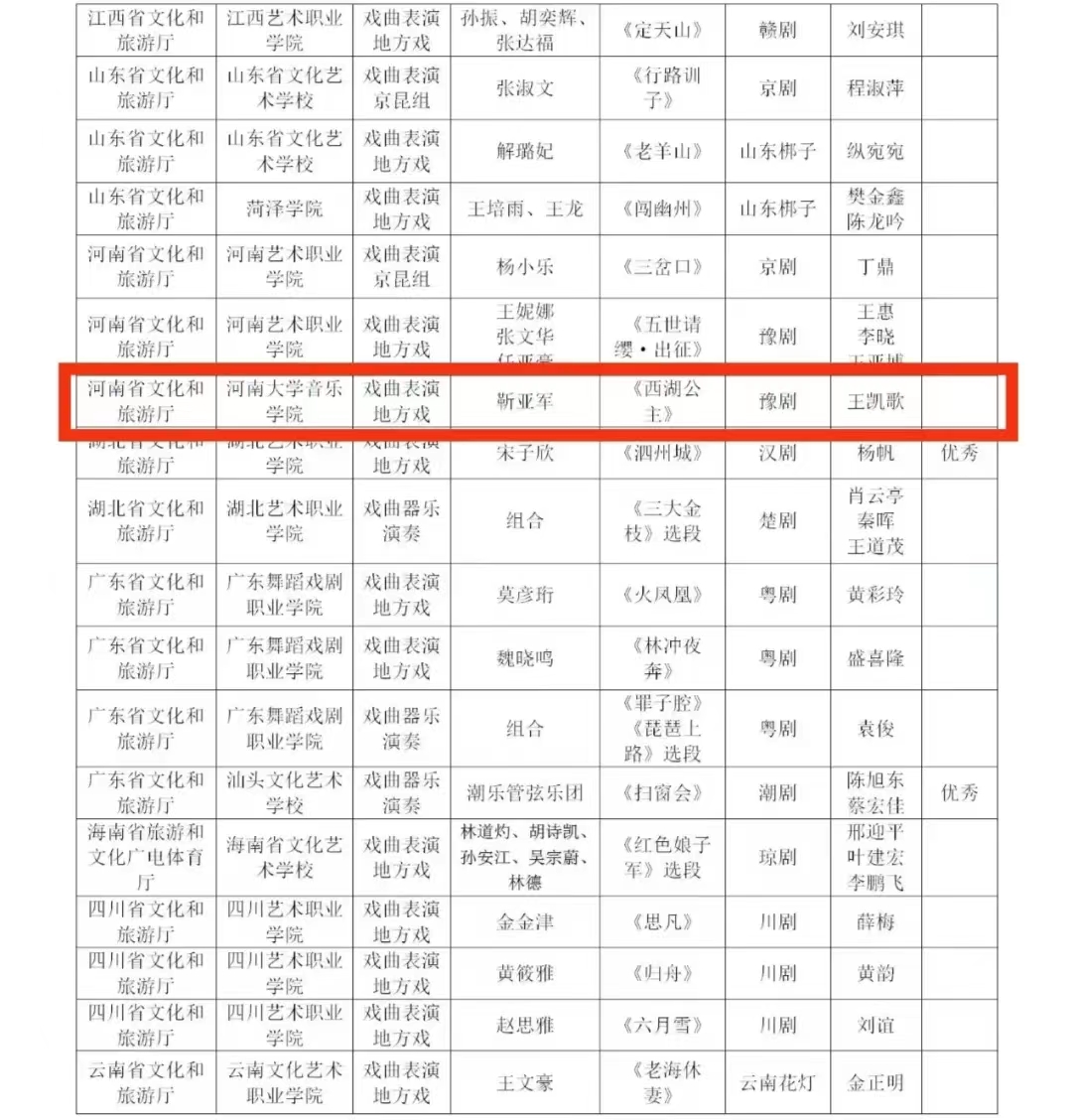 近日,由文化和旅游部科技教育司主办、中国戏曲学院承办的第四届“梨花杯”全国青少年戏曲教育教学成果展示活动入选名单公布,我院2021级戏曲演唱方向研究生靳亚军表演的豫剧《西湖公主》成功入选,同时荣获“戏曲盛世”2022全国首届戏曲网络大赛综合A组银奖。