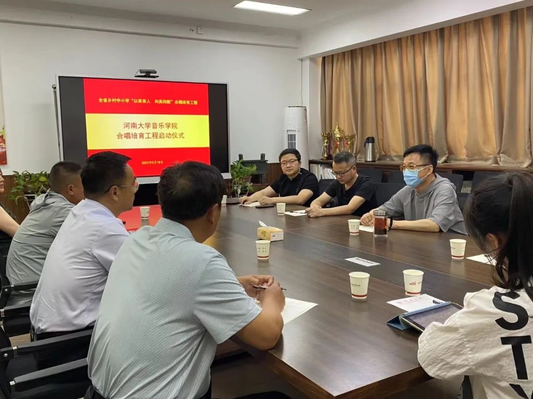5月18日下午,“以美育人 向美而歌”河南大学音乐学院合唱培育工程启动仪式在党建活动室举行。音乐学院院长王思琦、副院长徐晏、兰考东坝头小学校长雷云峰、杞县卓雅中学校长王介琳、合唱专职教师庞鸿飞、徐娟出席了本次活动。启动仪式由音乐理论系副主任袁凯主持。