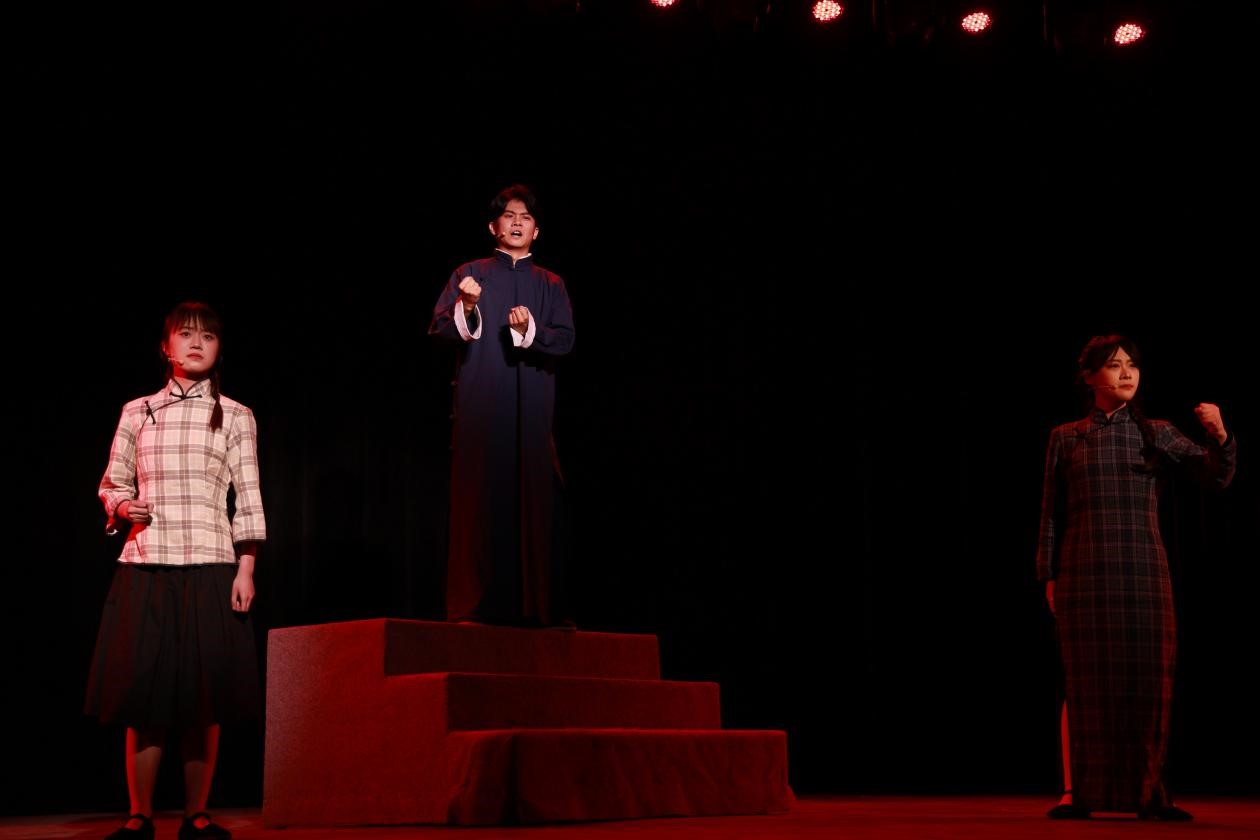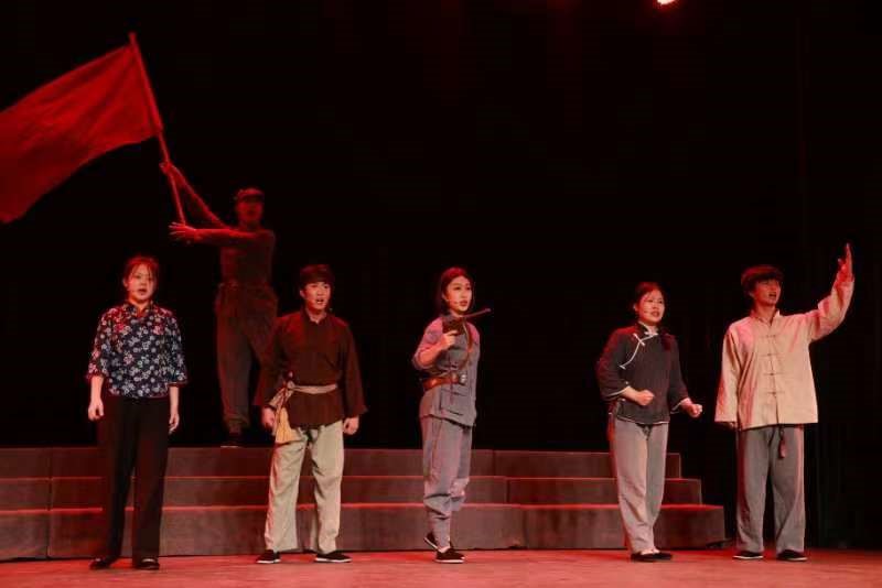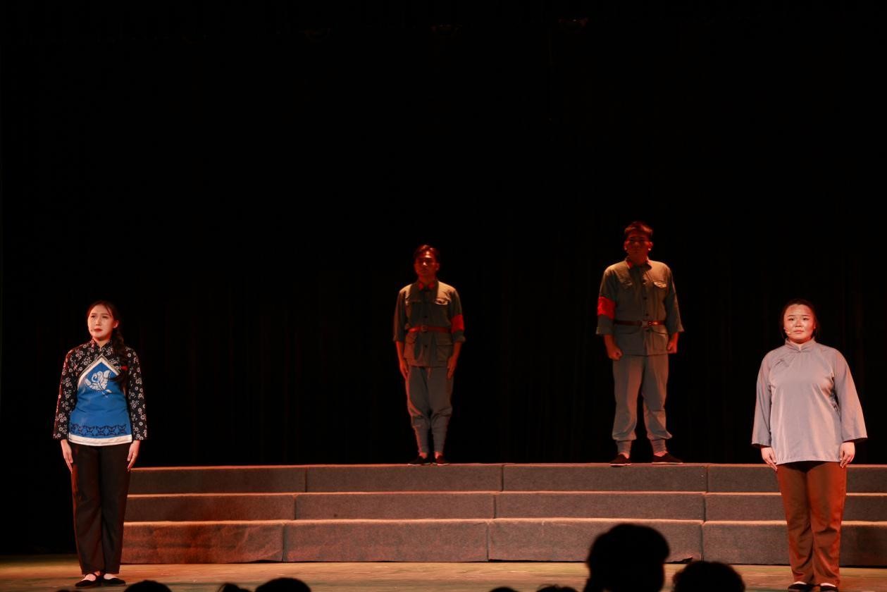 在舞台呈现中,戏剧专业的同学们通过课程教学中分析角色形象、挖掘人物内心,并通过“声、台、形、表”的综合专业技能的运用,生动鲜活的塑造了一个又一个深入人心的英雄形象,如:《为了新中国》中毅然托起炸药包的董存瑞,《红色乳娘》中血肉之躯护佑乳儿的胶东乳娘,《八女投江》里义无反顾迈向涛声滚滚的乌斯浑河中的抗联女英雄,《自白书》中高呼“人不能低下高贵的头颅”的革命烈士陈燃,以及《十七颗松》《无字家书》、《八月桂花遍地开》中至今传颂的红军战士。