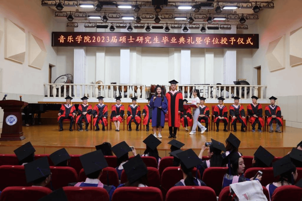 韶华如驶,时光如掷。6月30日上午,音乐学院2023届硕士研究生毕业典礼暨学位授予仪式在音乐厅隆重举行。音乐学院党委书记王志国,院长王思琦,正处级组织员徐书耀,党委副书记柴芳,副院长王新、徐晏、王聚伍,博士生导师韩梅,各系教师代表康长安、潘伟、张宗伟、张志鹏、李玉昆以及全体毕业生参加了典礼。典礼由柴芳主持。