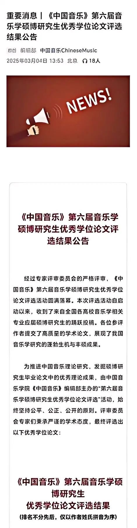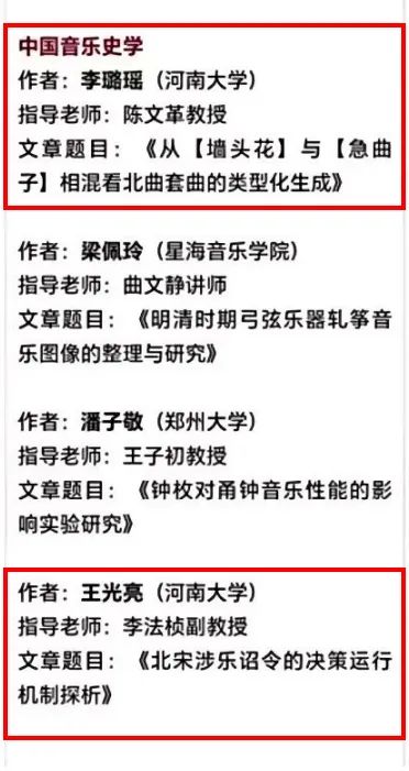 为促进中国音乐理论研究的深入发展,发掘研究生毕业论文中的卓越理论成果,中国音乐学院《中国音乐》编辑部举办了“第六届音乐学硕博研究生优秀学位论文评选”活动。经过评审委员会专家们秉持公平、公正、公开的原则进行评选,我院陈文革教授指导的硕士研究生李璐瑶、李法桢副教授指导的硕士研究生王光亮的论文,在“中国音乐史学”组别中脱颖而出,荣获“优秀学位论文”。